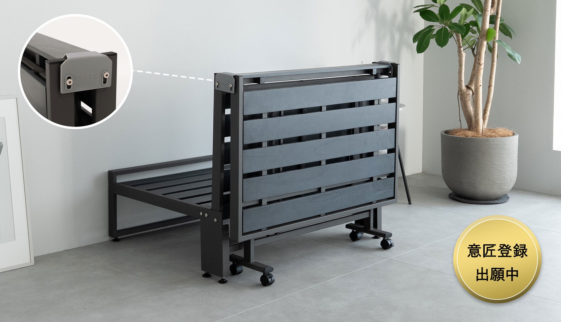 独自構造により、折りたたみ時もヘッド下には収納スペースを確保。さらに、折りたたんだフレームが低めの間仕切りのように機能し、マットレス・布団や枕まで視界から隠すことで生活感を抑え、すっきりとした空間を保てます。来客用スペースと寝室を兼用したい1Rや1K、1LDKなどの間取りで活躍が期待できます。