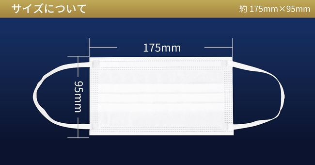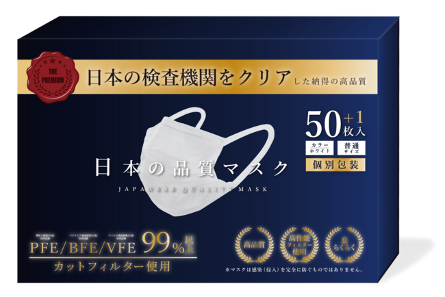 | 品質 | 国際規格のISO9001認定工場で品質管理を徹底 日本の公的機関での検査結果(医療レベル)で基準規格をクリアした証明取得済み ・PFE(微粒子ろ過効率)≧99%(0.1μm) ・VFE(ウィルス飛沫ろ過効率)≧99%(3.0μm) ・BFE(細菌ろ過効率)≧99%(3.0μm) |
