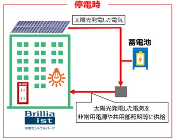 また、蓄電池を設置することで、太陽光パネルで発電した電気を夜間にも活用することができ、停電時においては非常用電源としても活用できる仕組みとしました。これにより、停電時に共用部照明やスマートフォン等の情報端末への給電が可能となるなど、賃貸マンションのレジリエンス(強靭性)の強化も実現しています。