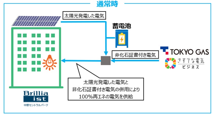 太陽光発電で賄うことができない共用部電気は、東京ガス株式会社が非化石価値取引市場で調達するトラッキング付き非化石証書が付与された「RE100」対応の電気「さすてな電気ビジネス※3」の供給を受けます。