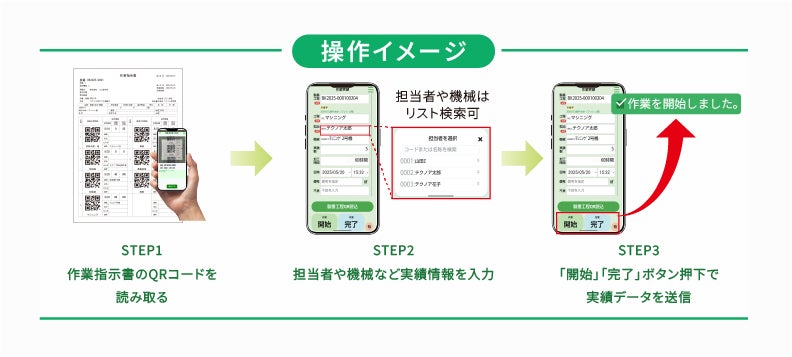 作業指示書のQRコードをスマートフォンで読み取るだけで、作業実績を登録でき、即座に進捗状況を反映します。複雑な操作や専門知識を必要とせず、現場スタッフが直感的に利用できる設計です。