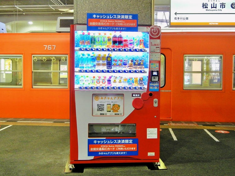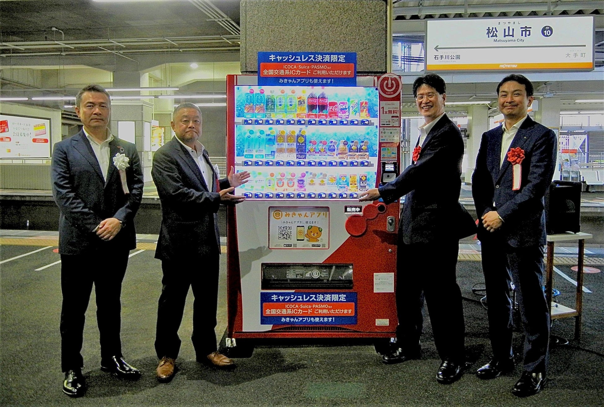 コカ・コーラ ボトラーズジャパン株式会社(本社:東京都港区、代表取締役社長 最高経営責任者:カリン・ドラガン、以下 当社)は、本日2024年7月30日、株式会社伊予鉄グループ(本社:愛媛県松山市、代表取締役社長:清水 一郎、以下 伊予鉄グループ)と連携し、伊予鉄グループの事業会社である株式会社デジタルテクノロジー四国の提供する「みきゃんアプリ」(注1)に対応したキャッシュレス決済限定のコカ・コーラ社自動販売機(以下、キャッシュレス決済限定自販機)(注2)を松山市駅(愛媛県松山市)と松山空港(愛媛県松山市)に設置しました。