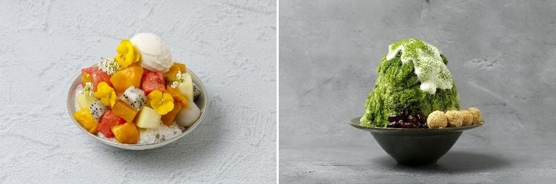 6月15日(土)より、14時30分~16時30分に提供されるかき氷メニュー。「フルーツパーラーかき氷」は、ミルクベースのかき氷に、たっぷりのフルーツとミルクアイスをトッピングしたまるでフルーツパーラーのようなカラフルで可愛らしいかき氷です。マンゴー・スイカ・メロン・ライチ・パイナップル・ドラゴンフルーツの6種を使用。「京都宇治抹茶と豆乳クリームのかき氷」は、京都宇治抹茶100%使用の大人な和風かき氷。豆乳クリームと甘く煮た黒豆、きな粉団子などのふんわりとしたトッピングが特徴。氷の中には香ばしい黒豆ゼリーとハト麦が入り、飽きのこない満足感のある一品。7月からは「桃」も登場します。
