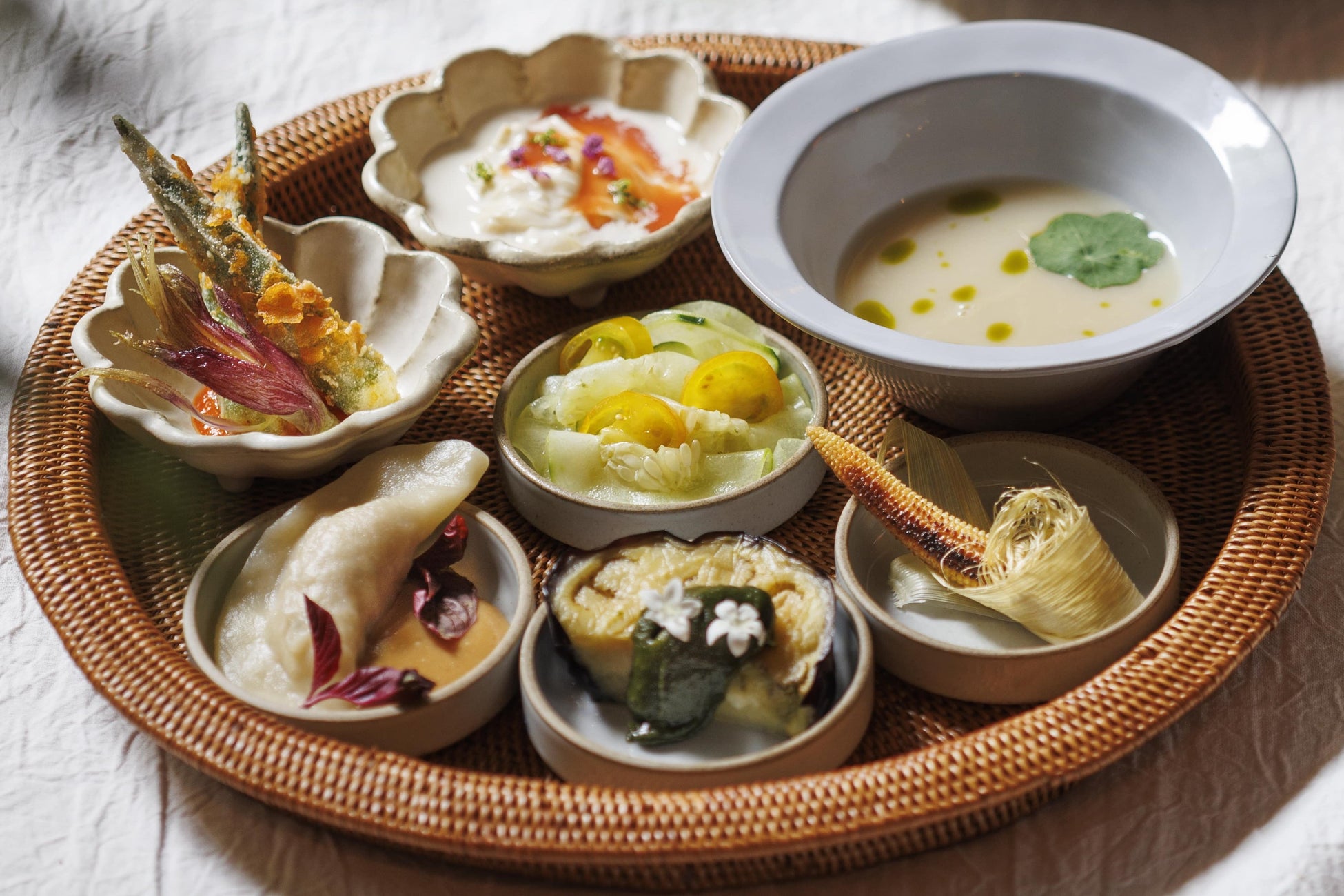 小鉢に盛り付けたおかずは、一皿ずつ京の食材を取り入れ、和食の趣を感じさせながらも、アジア料理や西洋料理との絶妙な組み合わせを楽しむことができます。まるでカプレーゼのような濃厚さと爽やかさを感じる汲み上げ湯葉 トマトの擦り流しや、抹茶を加えた味噌と京都産加茂茄子の田楽、瓜の爽やかな酢橘などが楽しめます。また、野菜の皮を煮詰めたベースをポタージュにした野菜を余すことなく使い切る「サスティナスープ」がつきます。