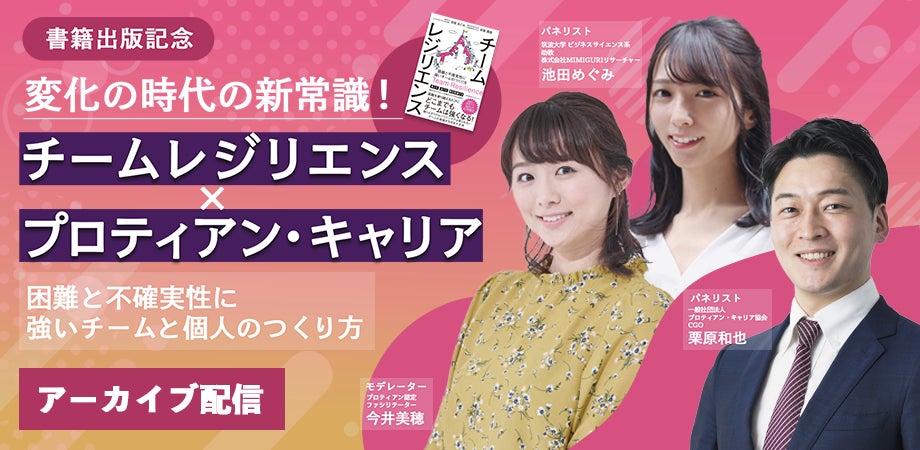 一般社団法人プロティアン・キャリア協会(東京都新宿区、代表理事:田中研之輔・有山徹、以下「当協会」)は、組織と個人のより良い関係構築と個人の主体的なキャリア開発を支援する団体です。この度6月26日(水)に開催したオンラインイベント「【書籍出版記念】変化の時代の新常識!『チームレジリエンス』×プロティアン・キャリア~困難と不確実性に強いチームと個人のつくり方~」のアーカイブ配信を開始したことをお知らせいたします。「チームレジリエンス 困難と不確実性に強いチームのつくり方」の著者、池田めぐみ氏をお招きして、一般社団法人プロティアン・キャリア協会CGO栗原和也と共に、チームレジリエンスとプロティアン・キャリア理論との相乗効果に触れながら、良いパフォーマンスを発揮するためにはどのような行動をしたら良いか、ダイアログ形式でお届けしました。