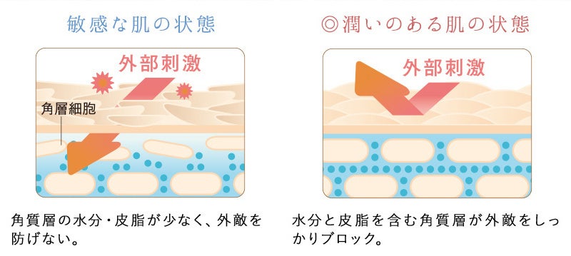 バリア機能が低下した肌は刺激を受けやすい状態になり、乾燥や肌荒れなど、肌トラブルのもととなります。また、肌が敏感になっているときは、スキンケアにも注意が必要です。いつものスキンケアがピリピリしたり、合わなくなることも。いつも以上に肌の状態を確認しながら、水分と油分を補いバリア機能を整えることが必要です。