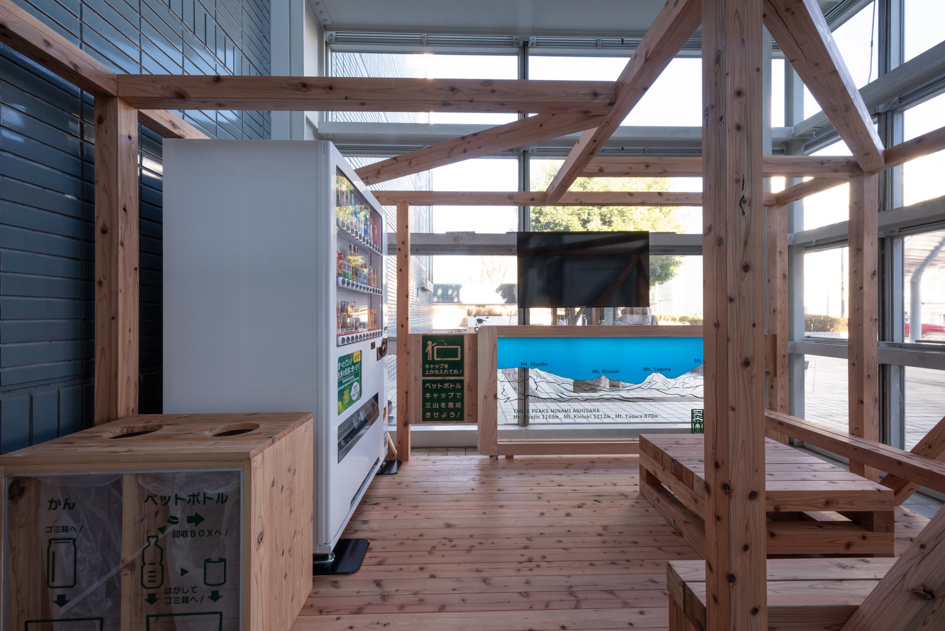 「カーボンニュートラル啓発空間」は南足柄市産のスギの間伐材を活用してつくられています。この空間では、カーボンニュートラルや資源循環に関する展示が行われ、足柄三山をモチーフにしたペットボトルキャップの回収オブジェも設置されています。展示物や「CO2を食べる自販機」を通じて、市役所を訪れる方々に環境への取り組みを知る機会を提供し、カーボンニュートラルの実現に貢献します。
