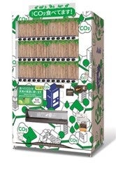 ※庫内にCO2を吸収する特殊材を搭載した自販機。1台当たりのCO2吸収量は稼働電力由来のCO2排出量の最大20%を見込んでおり、スギ(林齢56-60年)に置き換えると約20本分の年間吸収量に相当