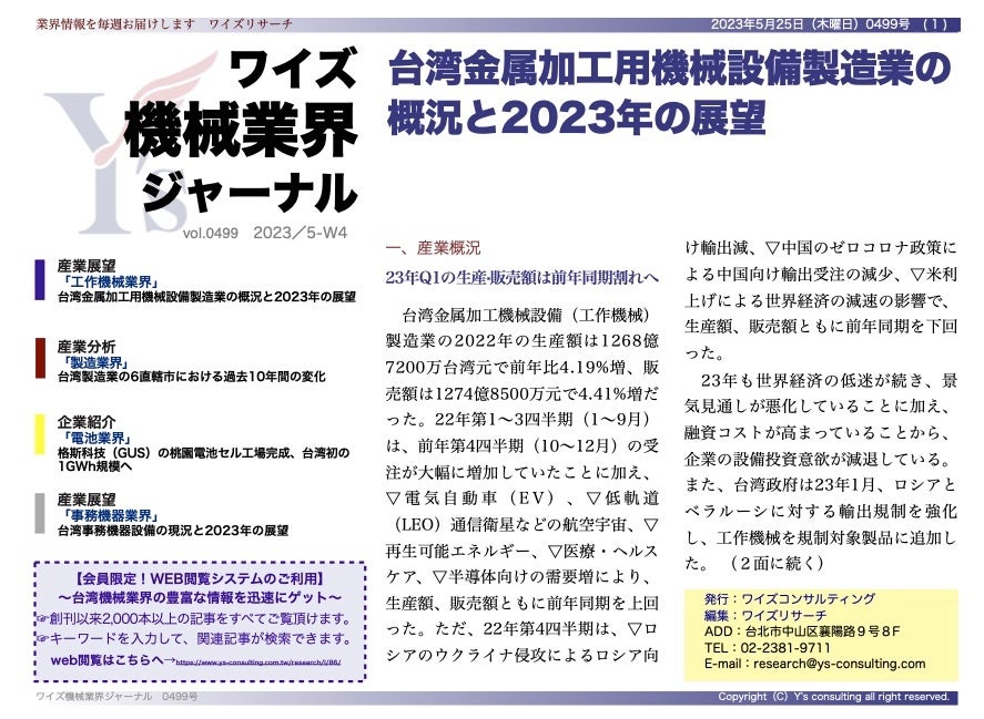 ワイズコンサルティング グループ(本社:中華民国台北市、代表取締役:吉本康志)は台湾機械業界専門誌「ワイズ機械業界ジャーナル」の2023年5月第4週号を発行しました。今週号では工作機械業界、製造業全般、電池業界、事務機器業界の動向を紹介します。