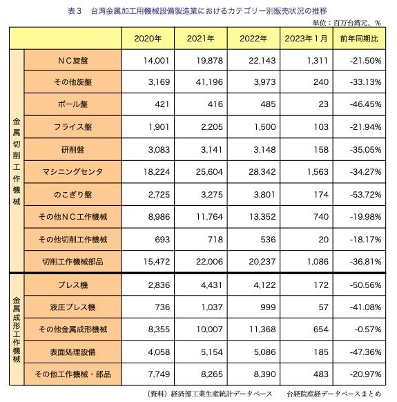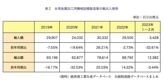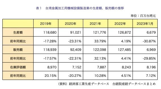 23年も世界経済の低迷が続き、景気見通しが悪化していることに加え、融資コストが高まっていることから、企業の設備投資意欲が減退している。また、台湾政府は23年1月、ロシアとベラルーシに対する輸出規制を強化し、工作機械を規制対象製品に追加した。さらに、外需の低迷で台湾製造業の設備投資も減少している。以上のことから、台湾当産業の23年第1四半期の生産額、販売額はいずれも前年同期を下回る見通しだ。
