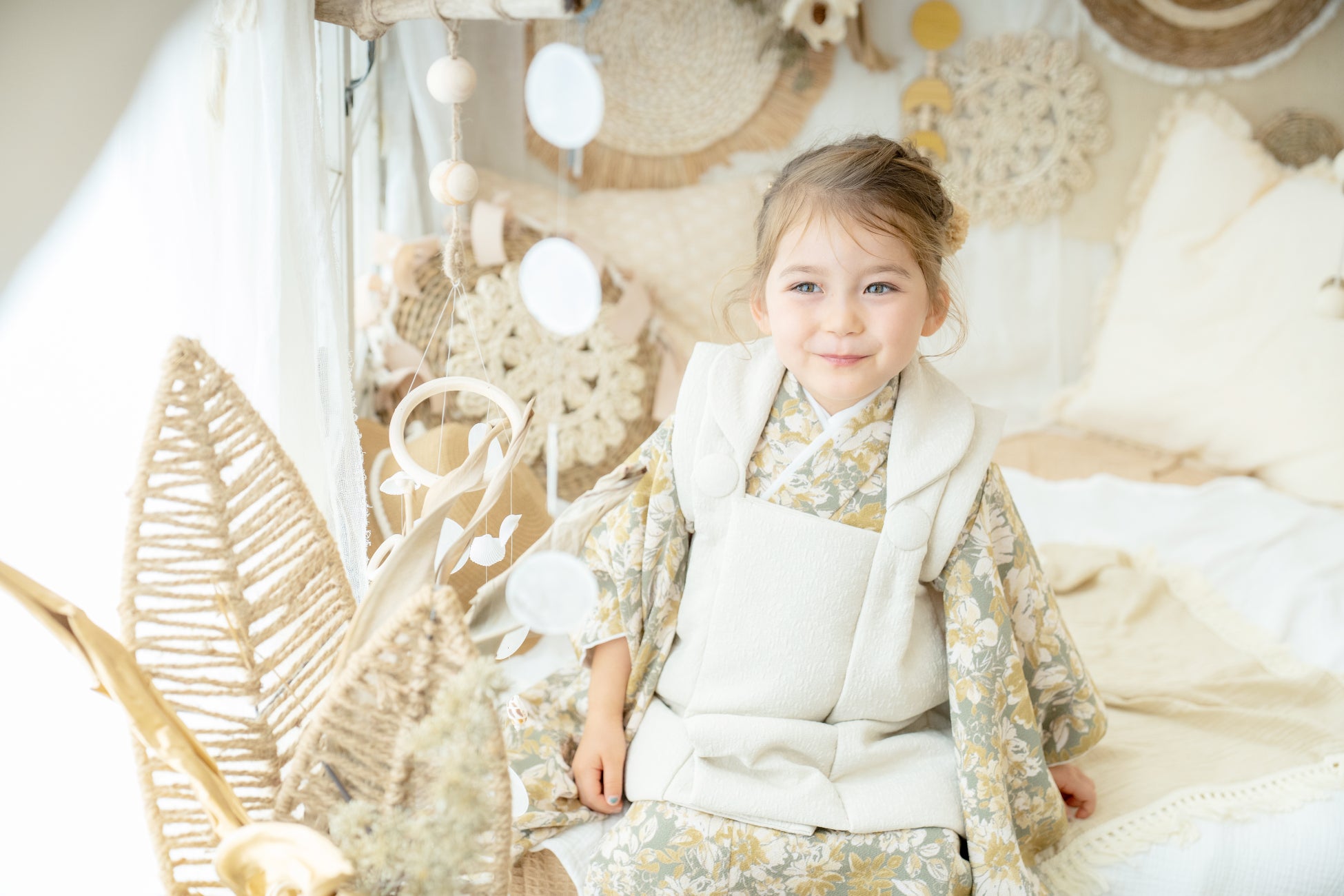 ~お子さまの成長の節目は、ゆったりと時間が流れるプライベート空間で。⾊合いにも質感にもこだわったコフレオリジナルのお⾐装で七五三やバースデーフォト、お食い初めなども~