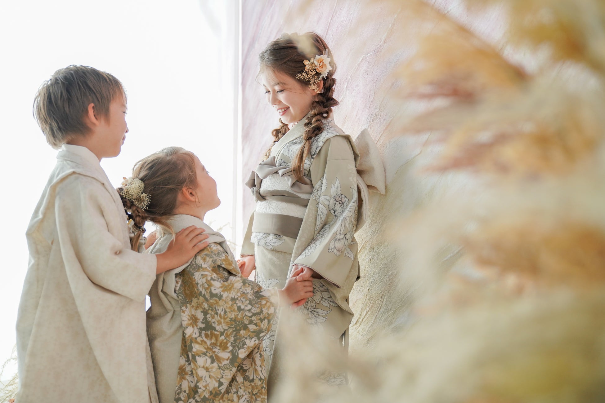特に、ビンテージとは異なる味わいのコフレオリジナル和装は七五三撮影でも大変人気が高く、ごきょうだいやご家族様のトータルコーディネートのご提案や、お⾐装のレンタルも可能です(※2)。お宮参りの産着レンタルサービスも承っており(※3)、撮影前後1か月の期間であれば無料でご利用いただけます。