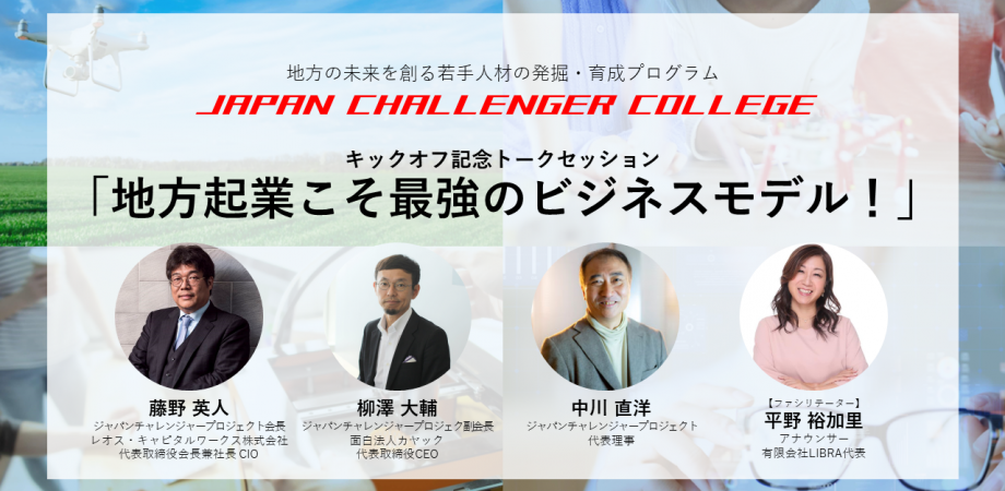 「JAPAN CHALLENGER COLLEGE」の開催に先駆けて、「地方起業こそ最強のビジネスモデルだ!」をテーマにしたオンライントークセッションを開催します。起業や新規事業に取り組まれている方にとっては、新しい事業のヒントや取り組み方が、これから挑戦しようとしている方にとっては、新しい一歩を踏み出すキッカケになるかもしれません。地方を盛り上げたい!新しいことにチャレンジしたい!そんな想いを持った方は必見なプログラムです!