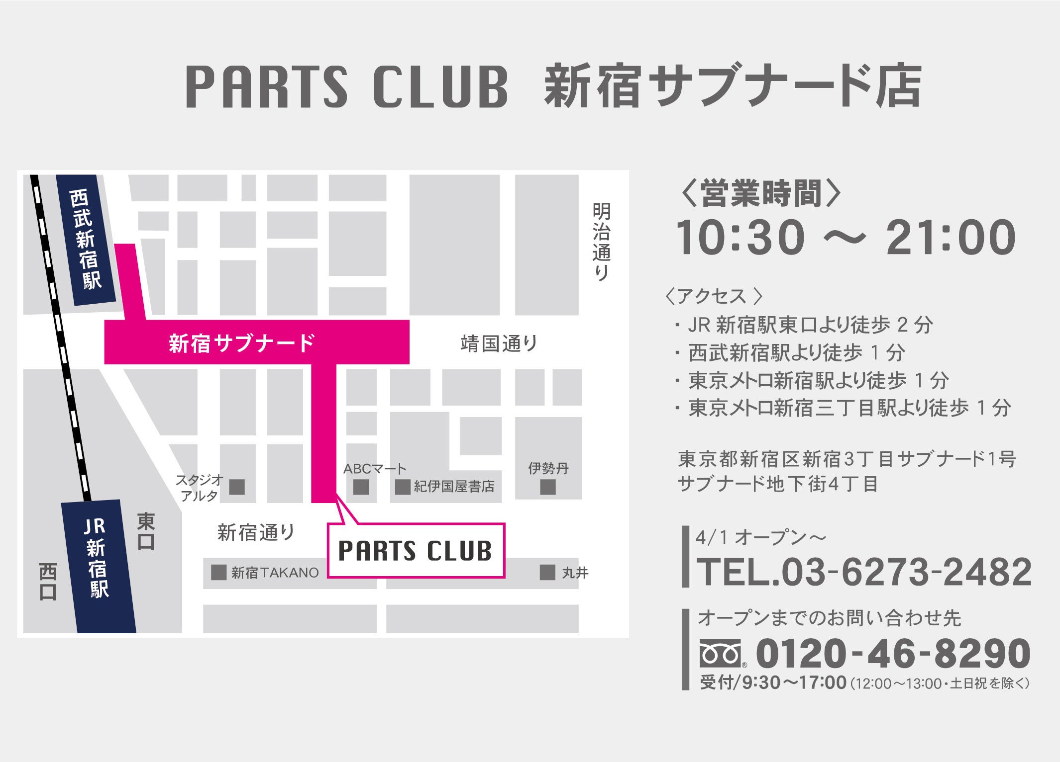新宿駅近く「新宿サブナード」にパーツクラブがオープンします。