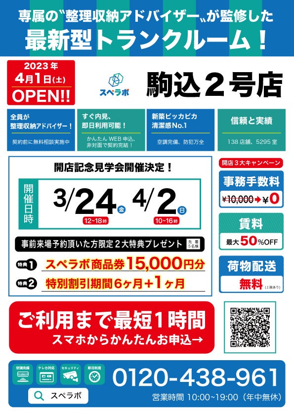 【駒込2号店/4月1日(土)オープン】見学から契約、解約まで完全非接触・非対面、お申し込みからご利用まで最短1時間!都内、大阪などにて絶賛運営中のトランクルーム【スペラボ】が駒込駅近くに出店!