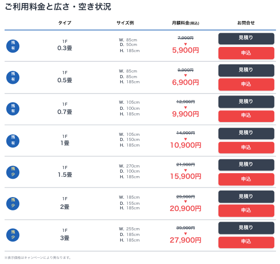 - 部屋タイプとサイズ、月額料金はこちら
