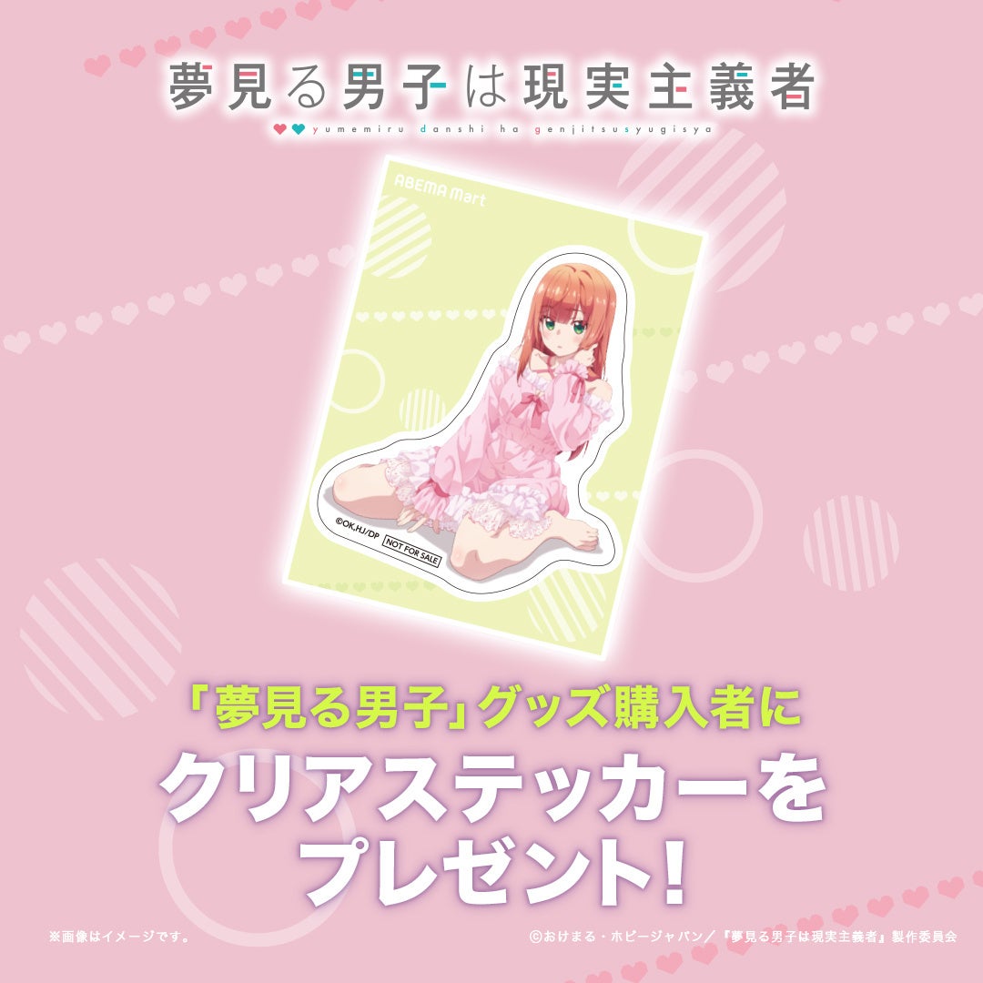 「ABEMA Mart」の『夢見る男子は現実主義者』特設ショップにて、販売中のグッズいずれかを購入された方を対象に、本描き下ろしイラストのクリアステッカーをプレゼント!