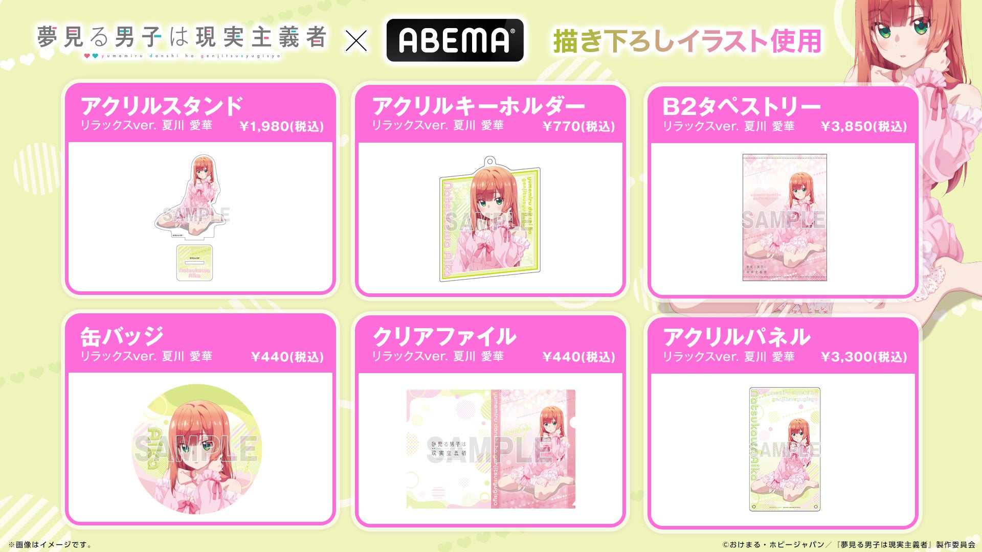 このたび、ABEMA公式オンラインストア「ABEMA Mart」内の、『夢見る男子は現実主義者』特設ショップにて、2023年8月14日(月)夜10時より、「ABEMA」オリジナル描き下ろしイラストを使用したグッズの先行受注販売が決定いたしました。ヒロイン・夏川愛華のネグリジェ姿を描いた本描き下ろしイラストより、アクリルスタンドや、アクリルキーホルダー、タペストリーなど6点を販売いたします。
