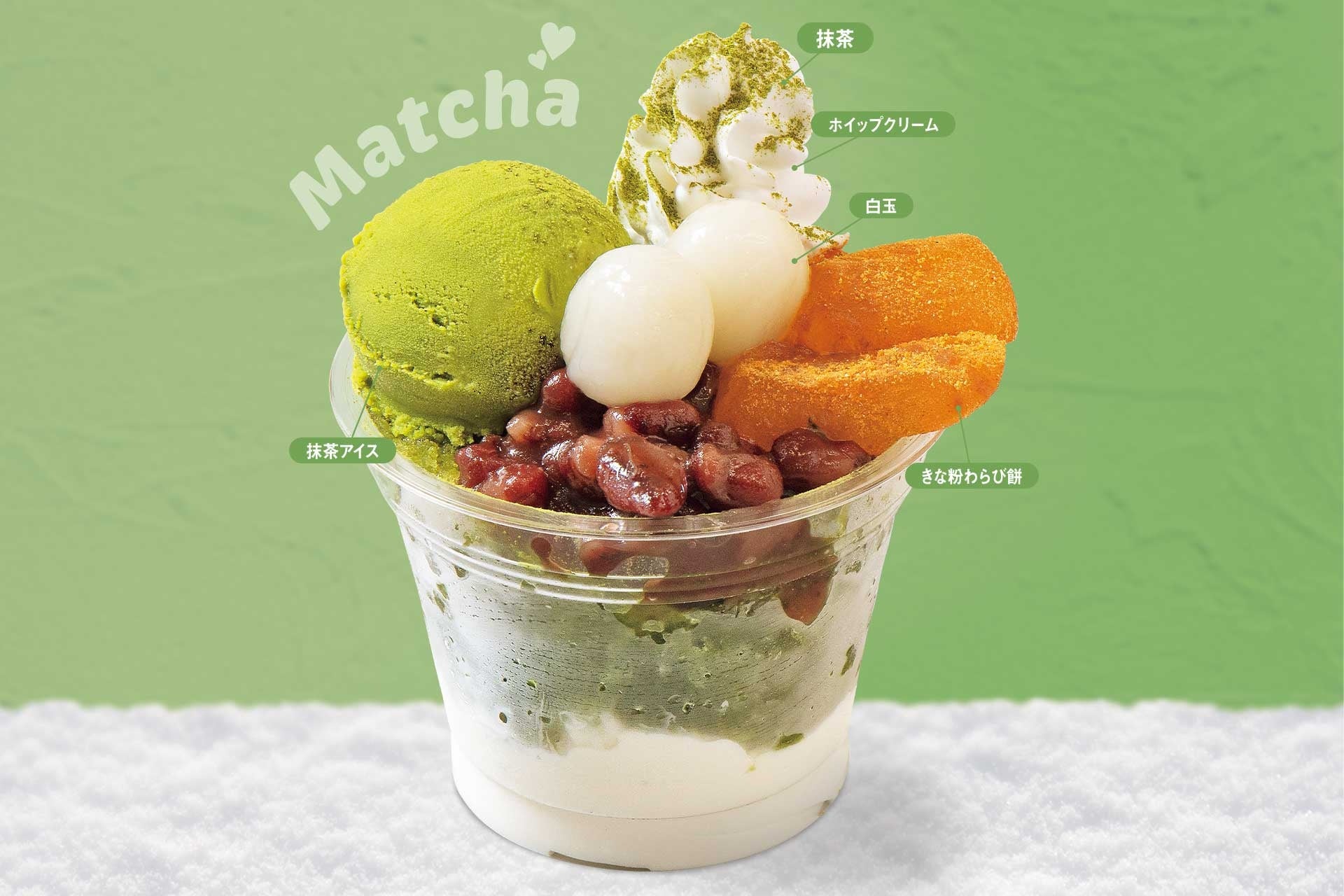 抹茶、ホイップクリーム、白玉、抹茶アイス、きな粉わらび餅、小豆、フラッペ、ソフトクリーム