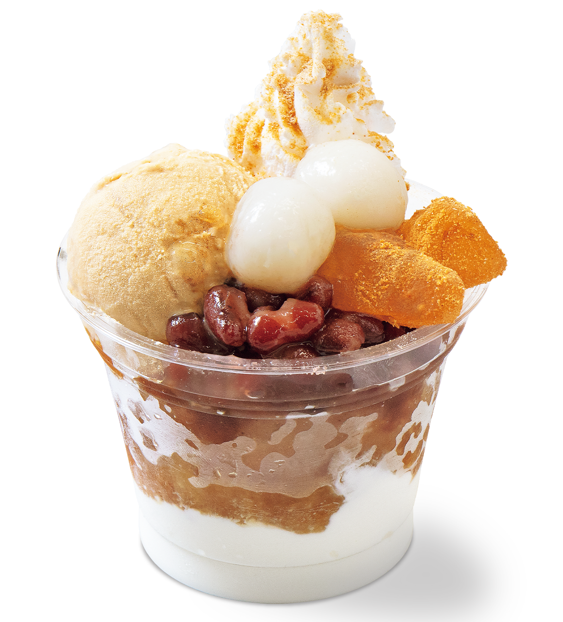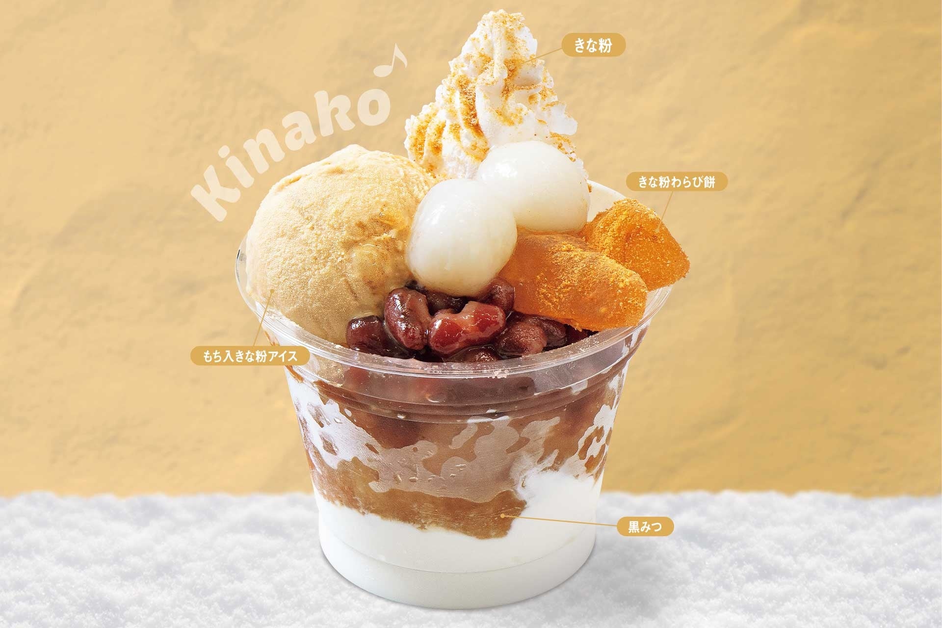 きな粉、ホイップクリーム、白玉、もち入きな粉アイス、きな粉わらび餅、小豆、黒みつ、フラッペ、ソフトクリーム