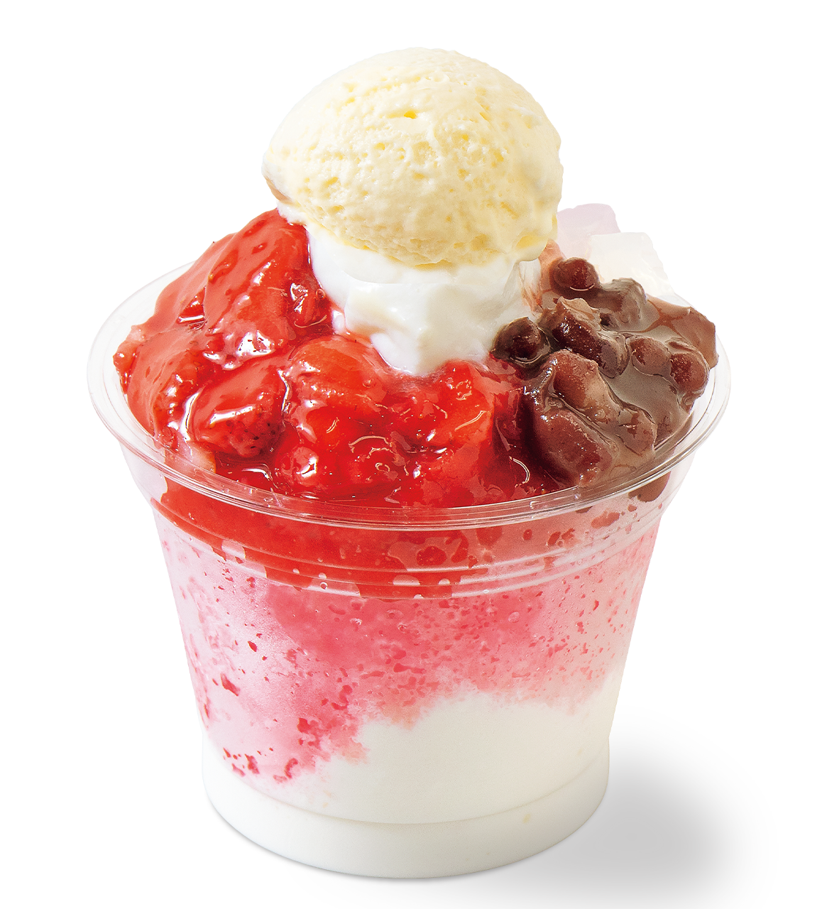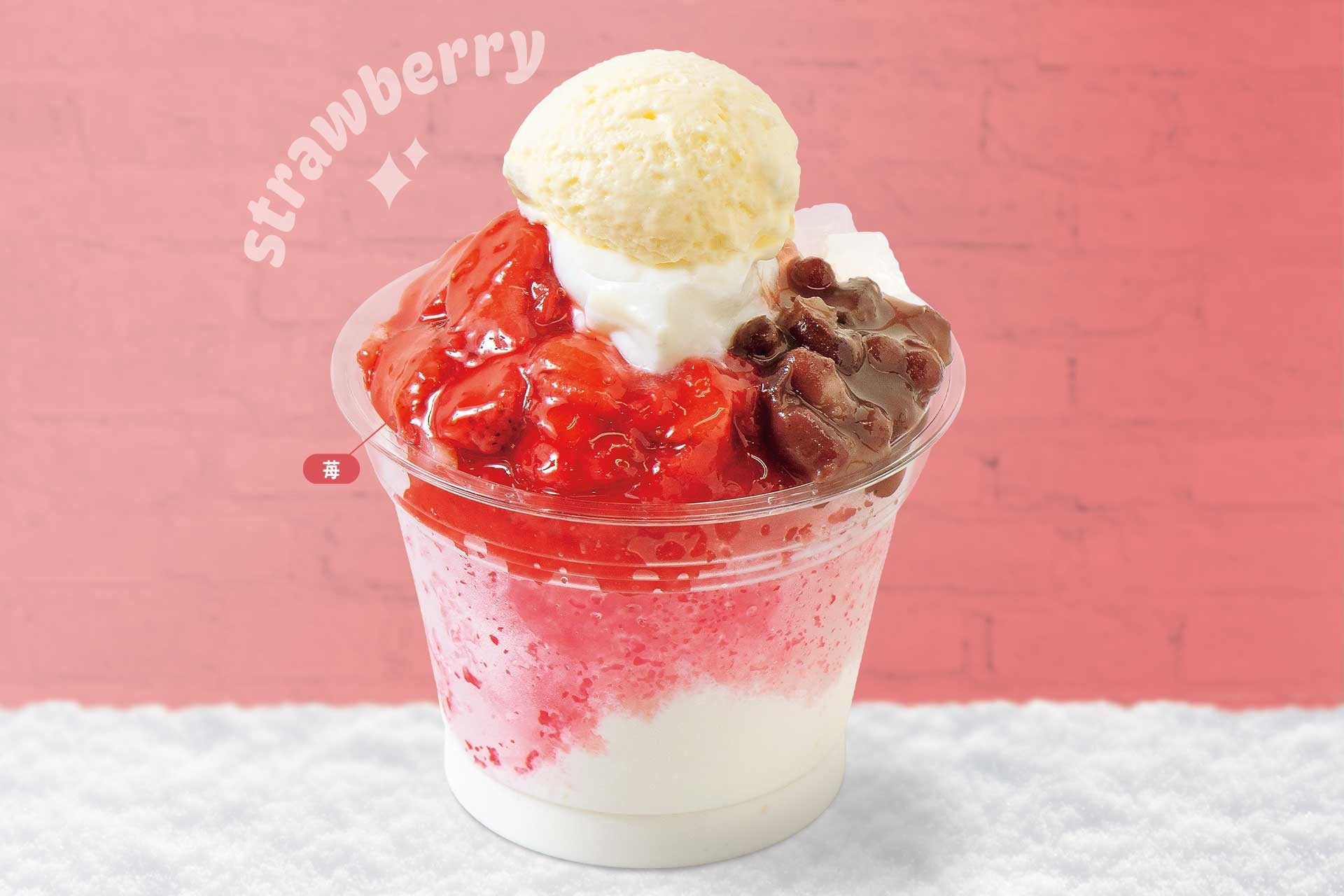 ふわふわムース、メルティ―クリーム、ナタデココ、苺、小豆、フラッペ、ソフトクリーム
