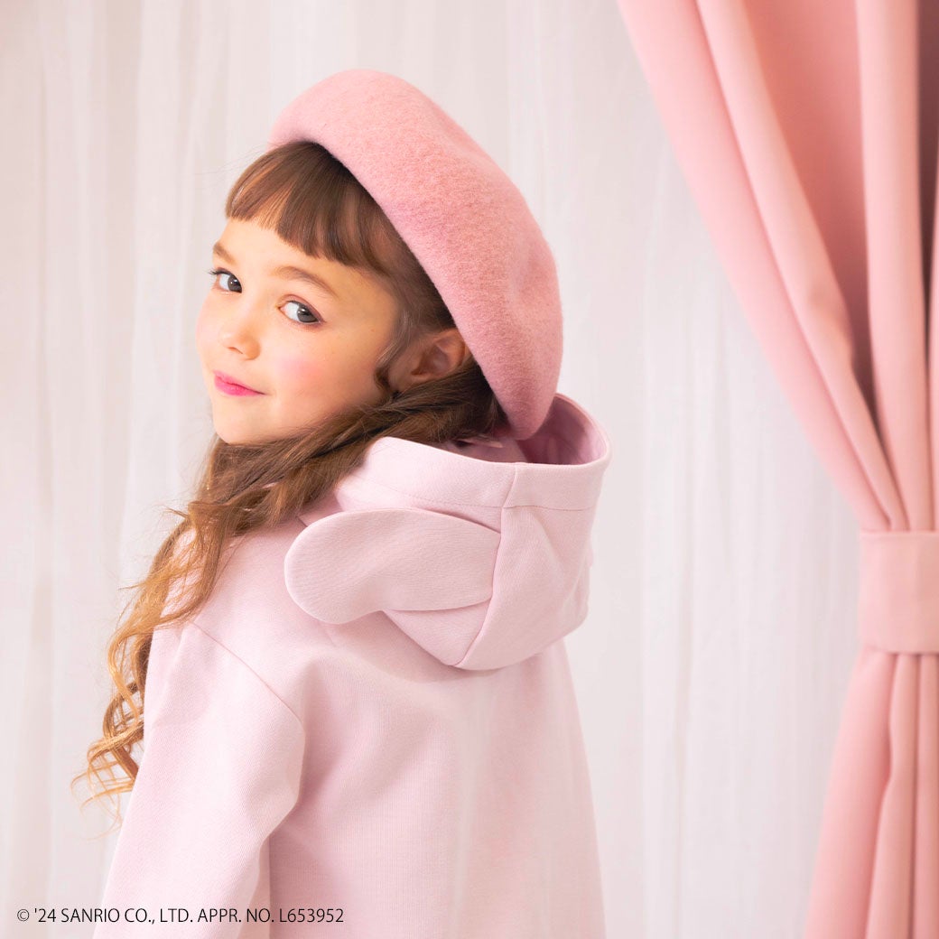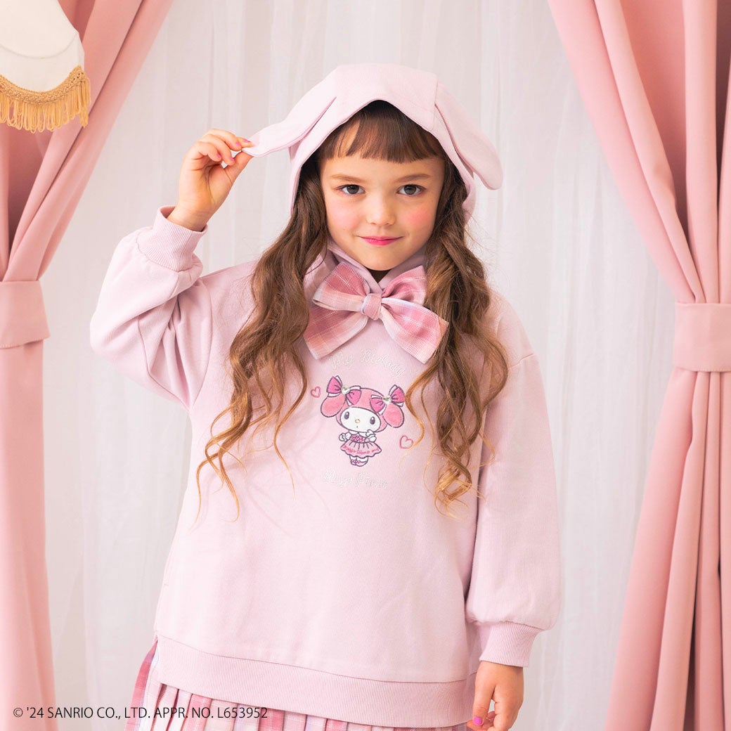 オリジナルアートをアップリケ刺繍したパーカワンピース。マイメロディをイメージしたカラーのチェック柄のプリーツスカートをドッキングしたデザイン。フードにはマイメロディの耳が付いていて後ろ姿もフードをかぶってもかわいいデザイン♪