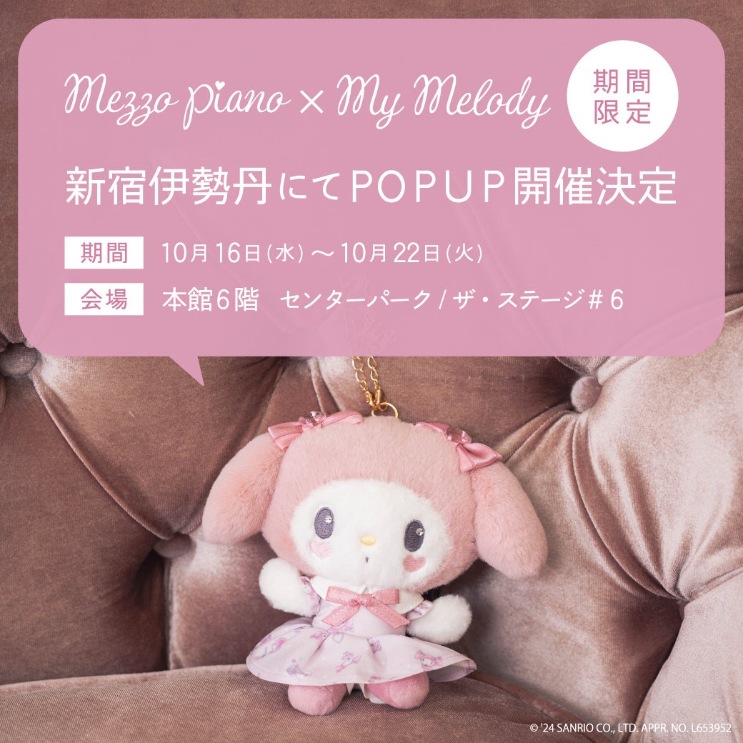株式会社ナルミヤ・インターナショナル(東京都港区芝公園2-4-1、代表取締役執行役員 社長: 國京 紘宇)のブランド「mezzo piano(メゾ ピアノ)」が、株式会社サンリオの大人気キャラクター「マイメロディ」とのスペシャルアイテムを2024年9月20日(金)より、順次全国直営店・公式オンラインショップ「ナルミヤオンライン(https://www.narumiya-online.jp/webshop/ )にてお取り扱いいたします。