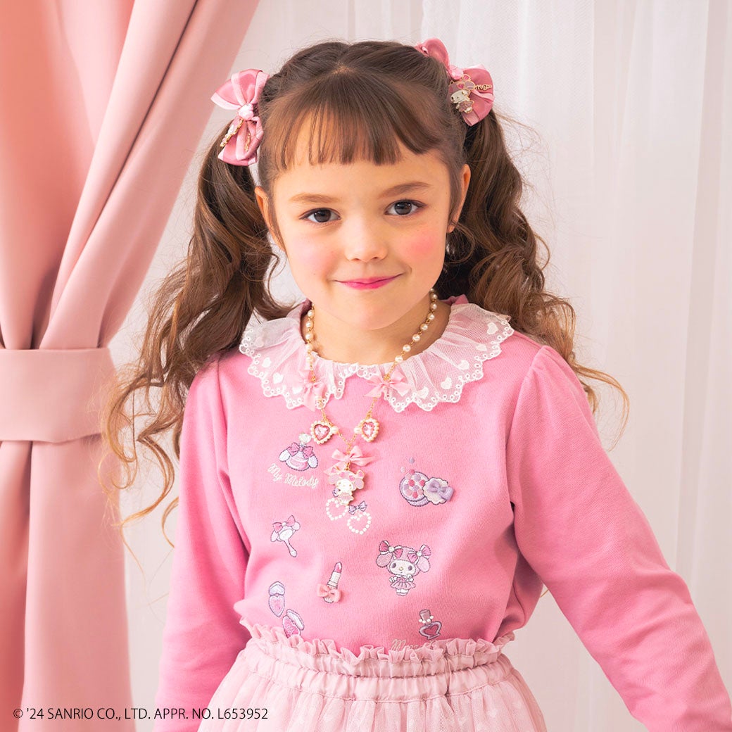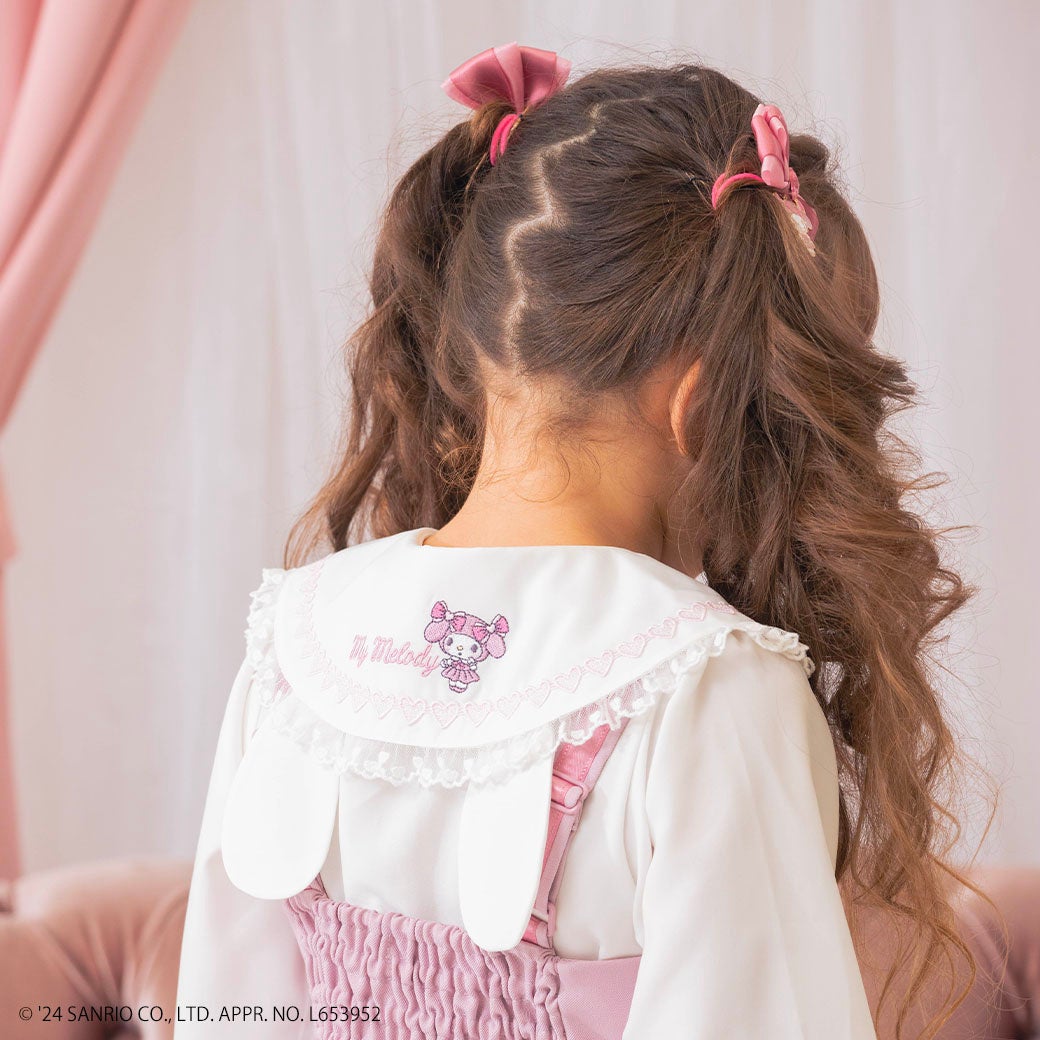 ブラウスはハートのレース&ボタンを使用して思いっきりガーリーに。後衿には、取り外し可能なマイメロディの耳つき♡