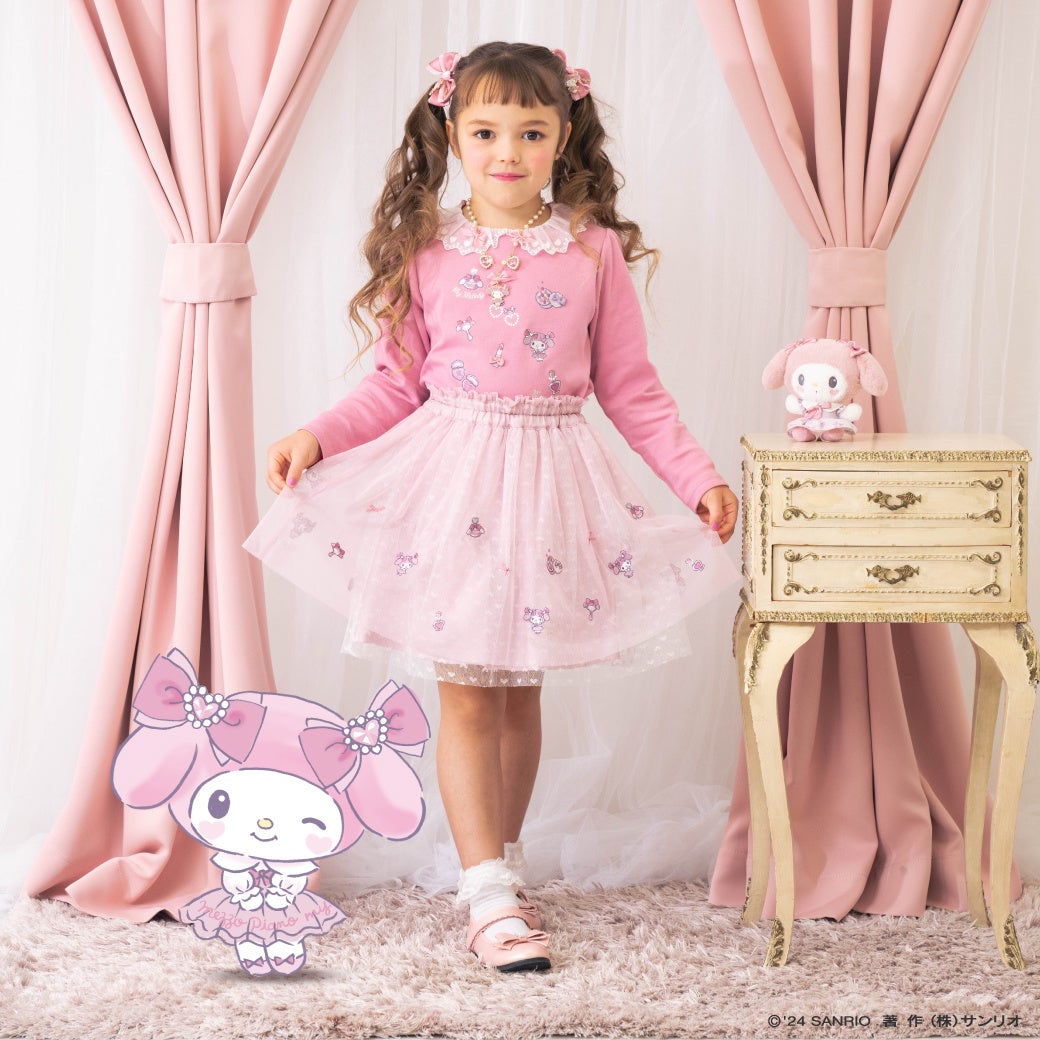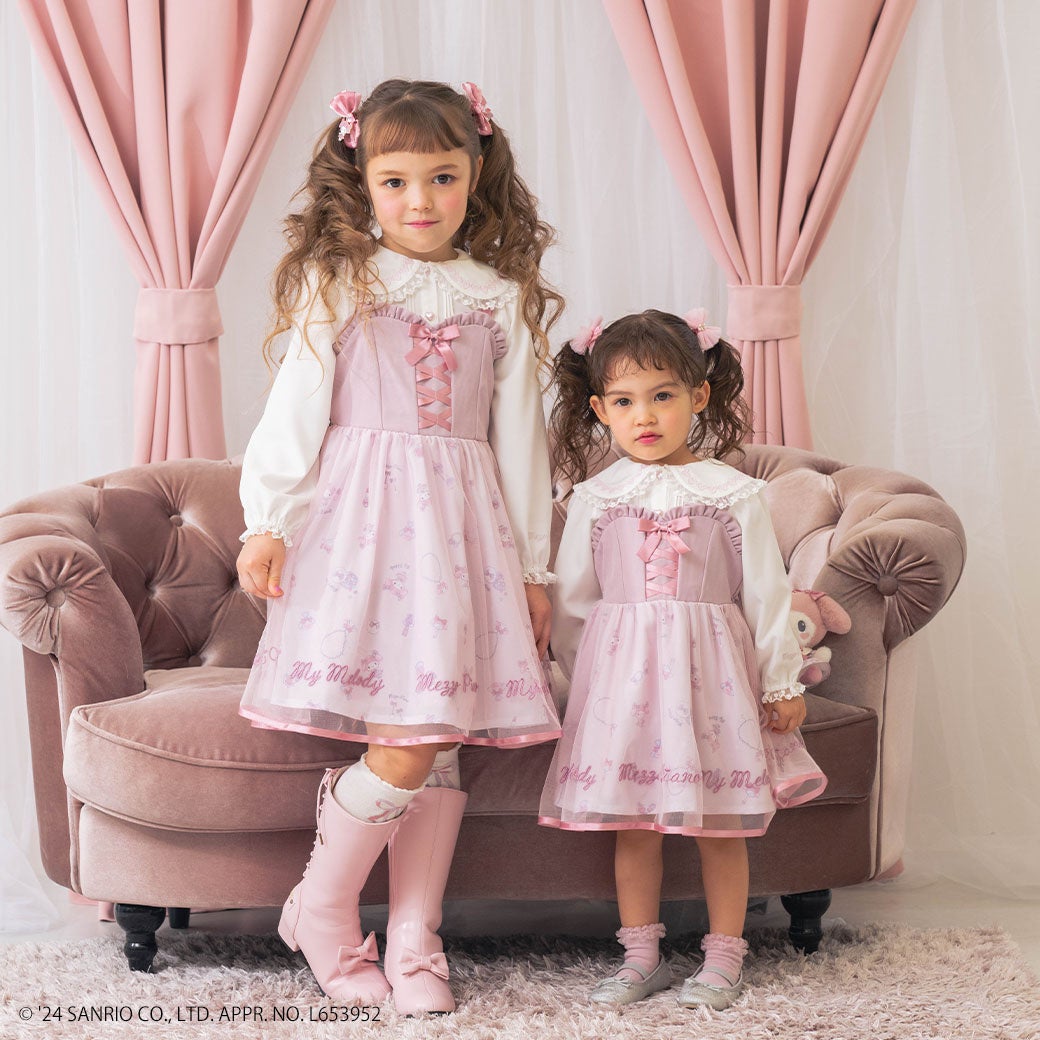 オリジナルのおめかし♡マイメロディアートの総柄プリントを使用したワンピースとブラウスのセットは、チュールを重ねたスカートでふんわり広がるシルエットが女の子らしいポイント。