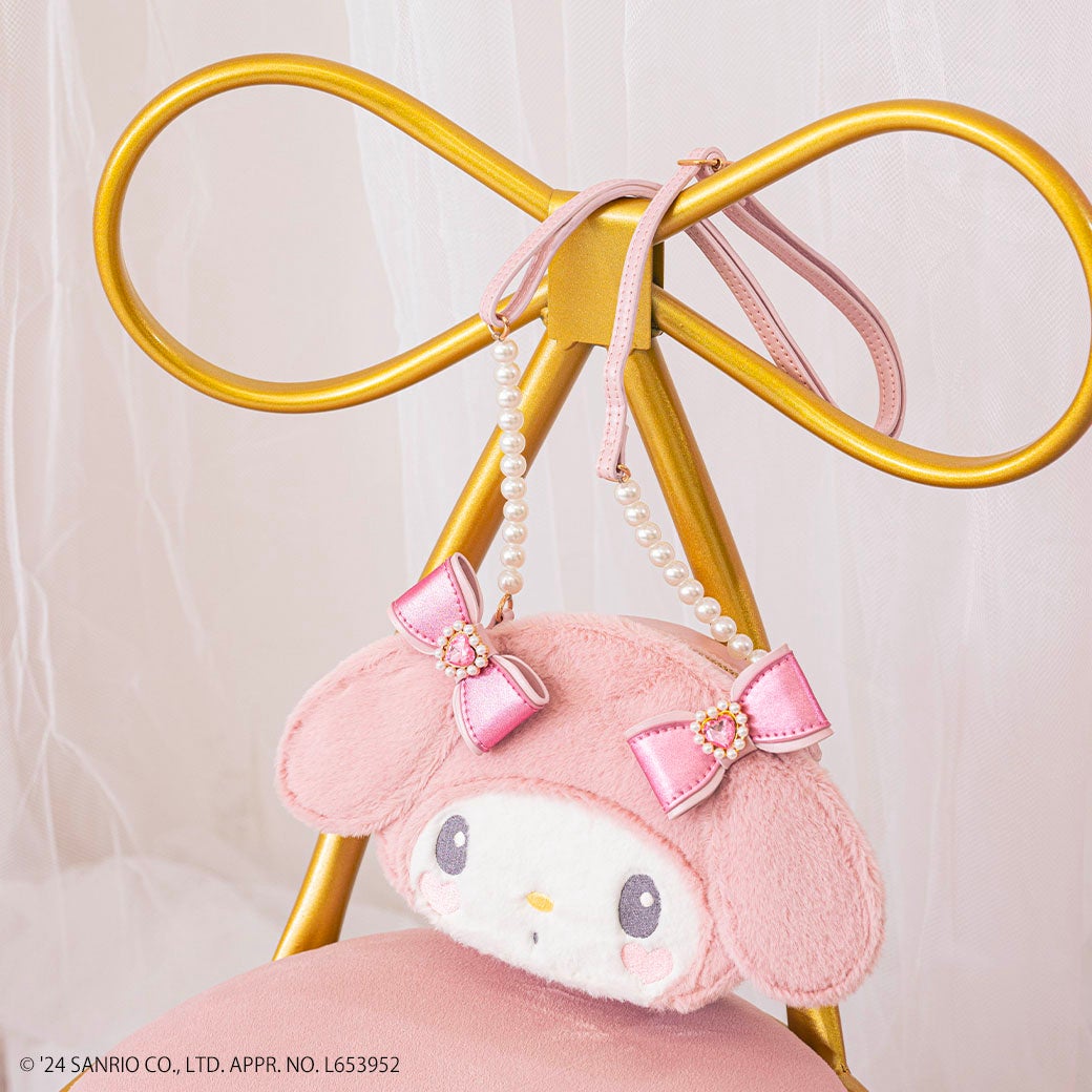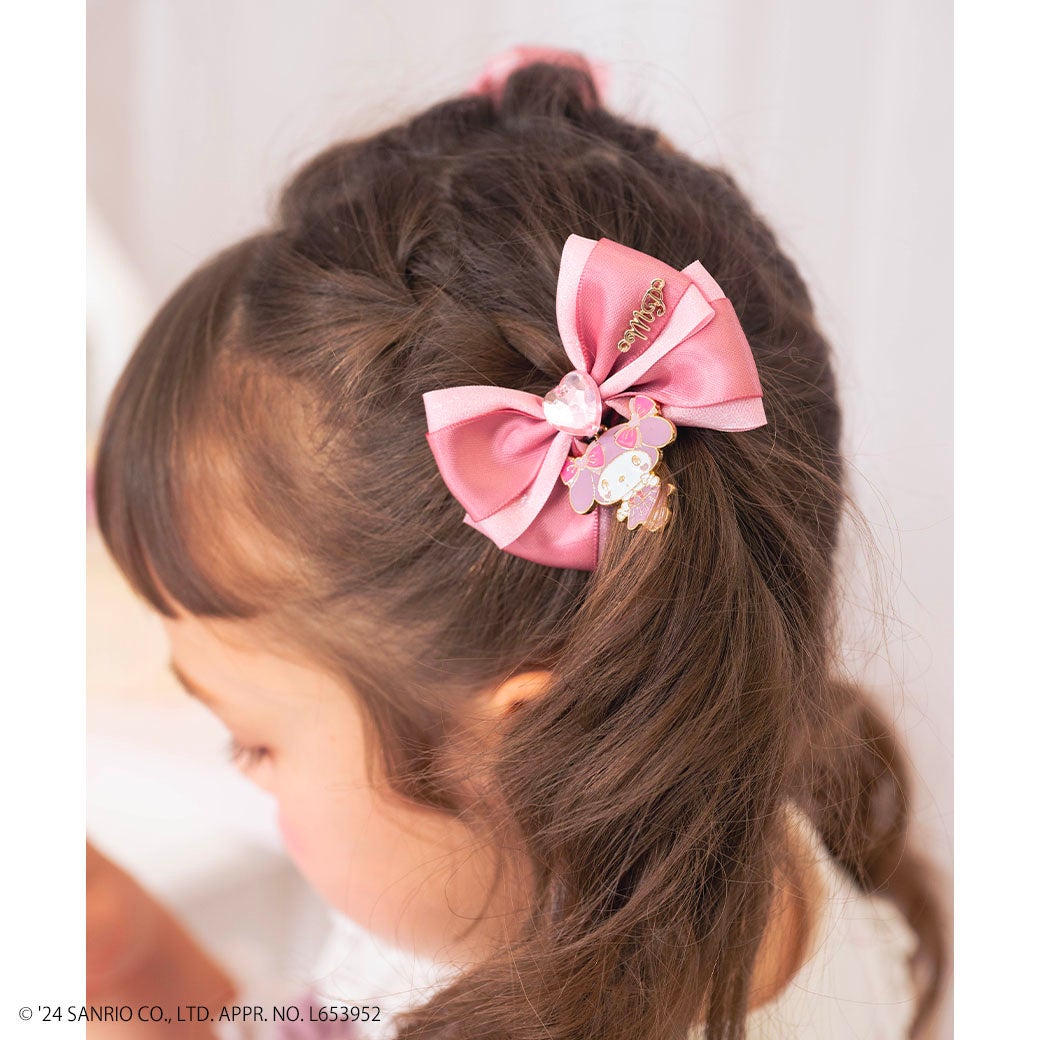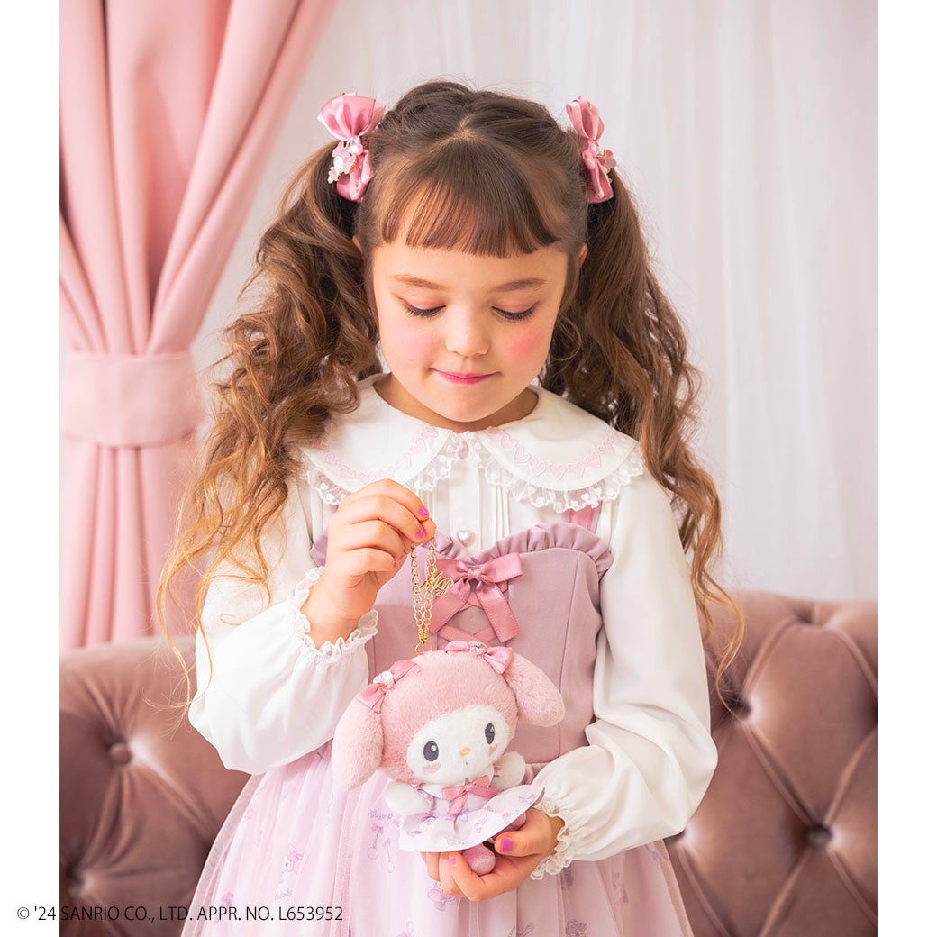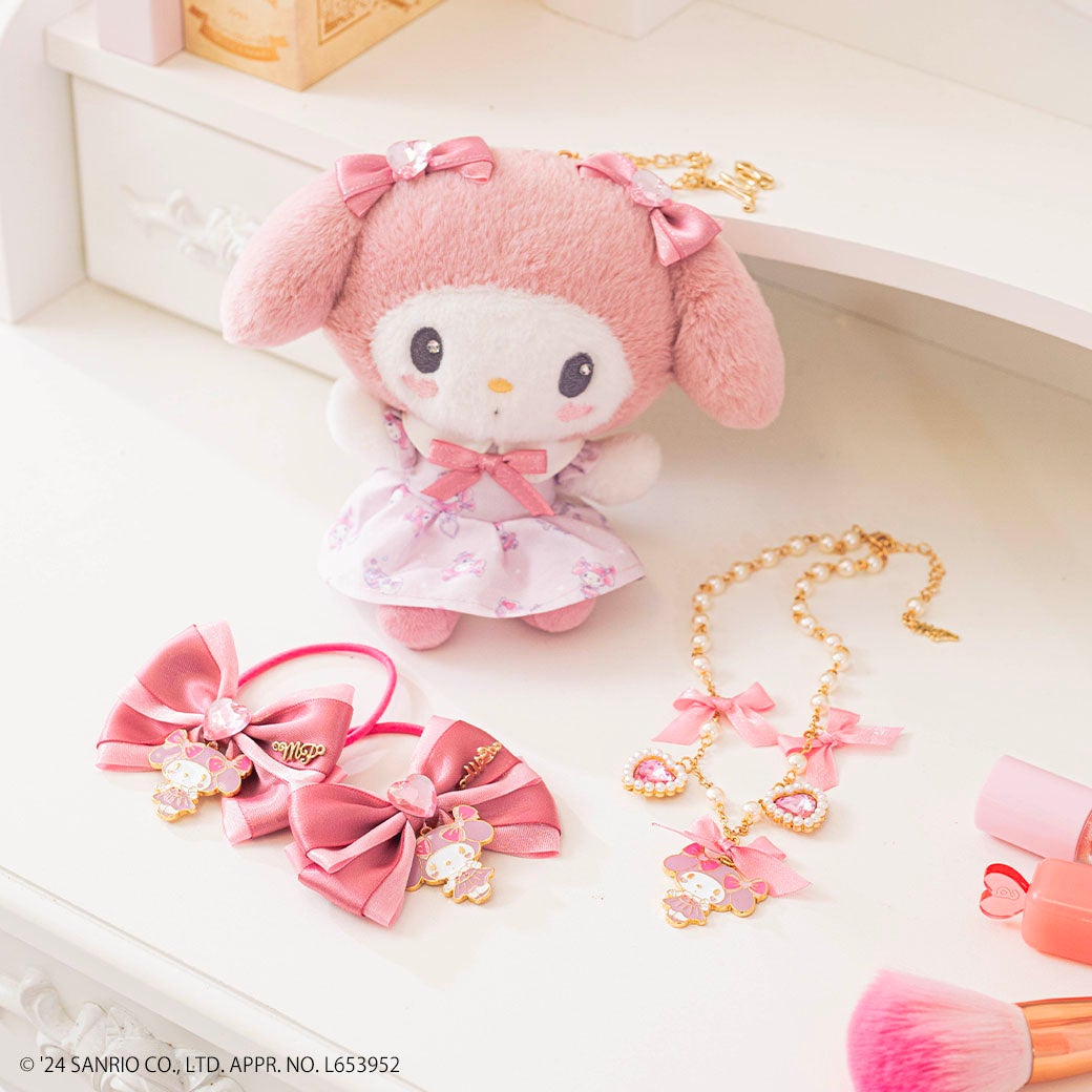 オリジナルで描き起こした、「おめかし♡マイメロディ」のアートをそのままぬいぐるみにしたキーチャームは、キャミワンピとお揃いデザインのお洋服を着せたので、マイメロディとリンクコーデが楽しめます。また、リボンのヘアポニーや、存在感のあるネックレスや、ショルダーバッグなど大人も使えるデザインで親子でお揃いもできる展開となっています。