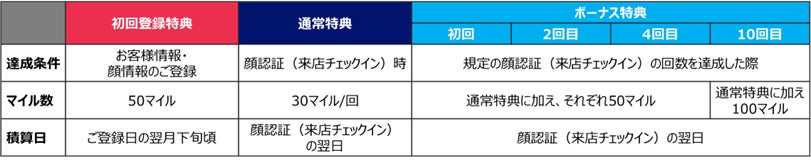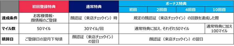 ANAのマイル* 1. 初回登録で50マイル 2. 顔認証(来店チェックイン)1回ごとに30マイル 3. 顔認証(来店チェックイン)回数に応じて、さらにボーナスマイル(初回、2、4、10回目) ※同日中、同一対象店舗での来店チェックインの上限回数は1回です。 ※期間中における来店チェックインの上限回数は20回です。 ※本実証実験により積算するマイル数は最大900マイルです。 |