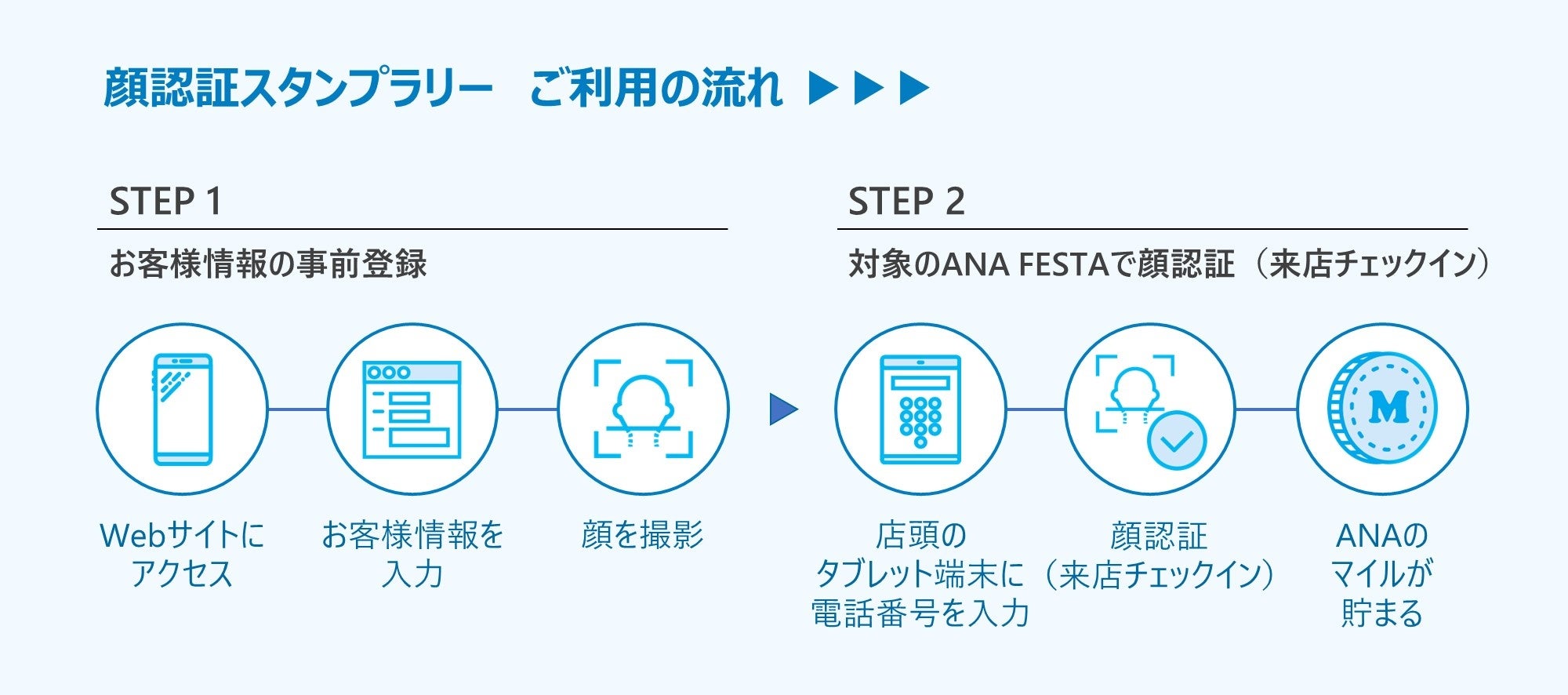 これまでANA FESTAでは、2021年8月27日に開店した無人決済店舗「ANA FESTA GO羽田B1フロア店(呼称:エイエヌエー フェスタ ゴー)」を始め、様々な取組みを行ってまいりました。この度、新たな取組みとして、お客様自身のカメラ付きデバイス(タブレット、スマートフォン)でお客様情報(氏名・メールアドレス等)と顔情報を専用サイトより事前登録いただき、対象店舗にご来店頂いた際に、店頭設置のタブレット端末で顔認証(来店チェックイン)することで、ANAのマイルが貯まり、さらにANA FESTAでのおすすめのお土産情報などを入手、顔認証(来店チェックイン)の回数に応じて、ボーナスマイルも貯められる「顔認証スタンプラリー」の実証実験を実施することとなりました。当実証実験を通じて、お客様に新たな顧客体験を提供することで、店舗集客を図り、さらにANAマイレージクラブお客様番号(10桁)に紐づく属性・ご利用データを元に、多様化するお客様のニーズに合わせたマーケティング活動を進めてまいります。