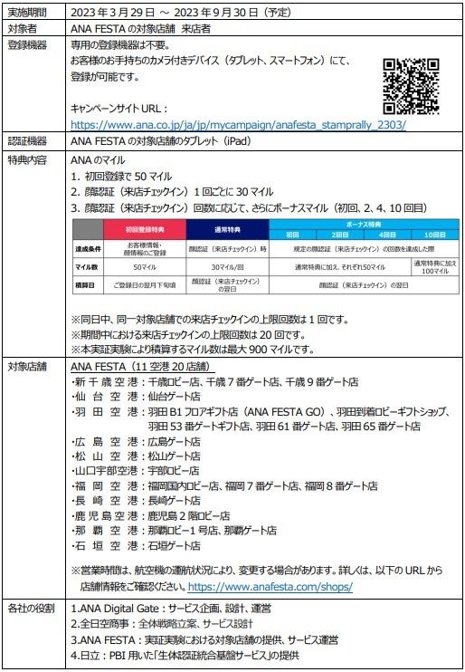 | 各社の役割 | 1.ANA Digital Gate:サービス企画、設計、運営 2.全日空商事:全体戦略立案、サービス設計 3.ANA FESTA:実証実験における対象店舗の提供、サービス運営 4.日立:PBI用いた「生体認証統合基盤サービス」の提供 |