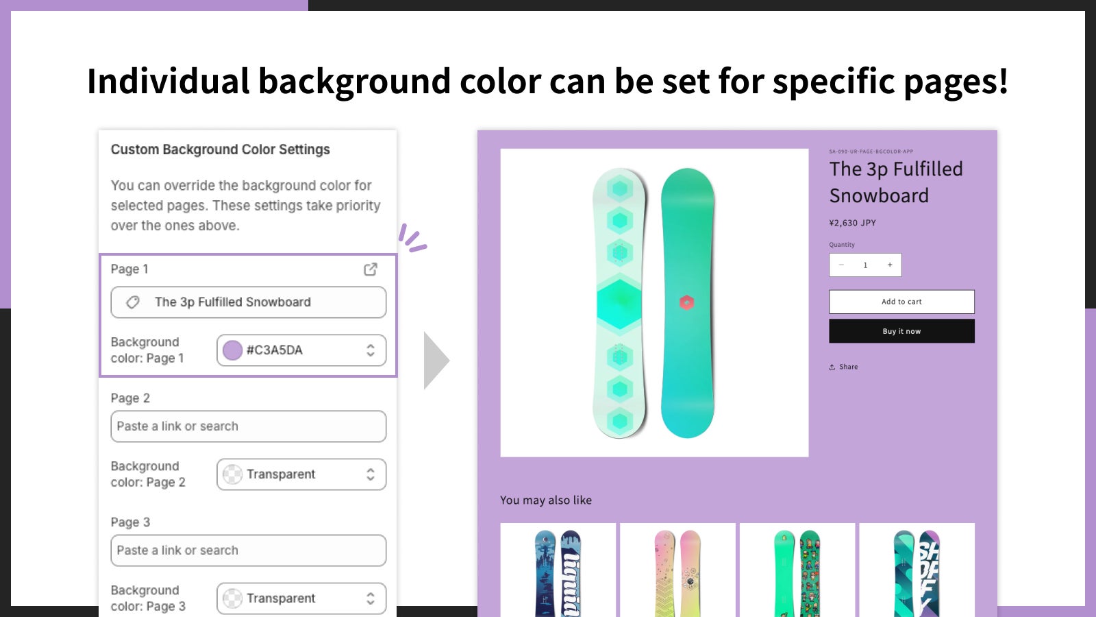 「UR: Page Background Color」は「シンプルページごとの背景色|お手軽 BgColor」の海外版 Shopify アプリで、Shopify ストアの各ページに対して好きな背景色を簡単に設定することができます。通常、テーマのコードを編集しないと変更しにくい背景色を、ノーコードかつシンプルな操作でページ単位に切り替えることができます。