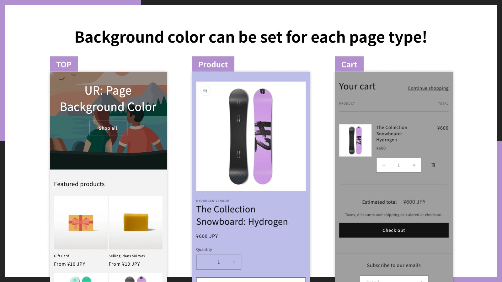 「UR: Page Background Color」は、Shopify ストア上のあらゆるページの背景色をカスタマイズすることができる Shopify アプリです。