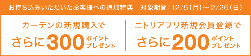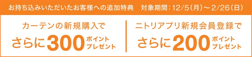 また、カーテン回収キャンペーンにご協力いただいたお客様で、対象期間中(12月5日(月)~2月26日(日))、以下条件に該当されるお客様には、更にニトリポイントをプレゼントいたします。