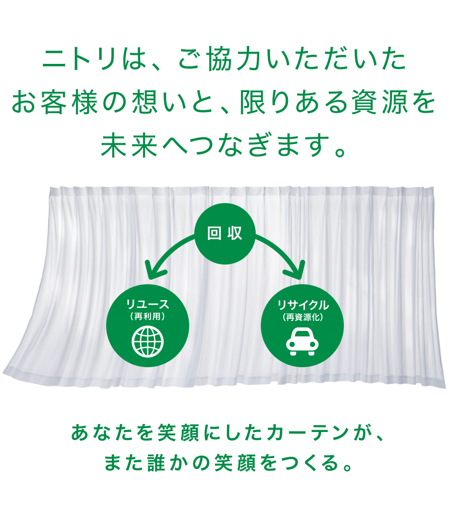 お客様がご愛⽤した品を、「ごみとして捨てる」のではなく、ニトリにお持ち込みいただくことで、「資源」につなげ、お客様に安⼼してつぎのお買い物を楽しんでいただきたいと考えています。