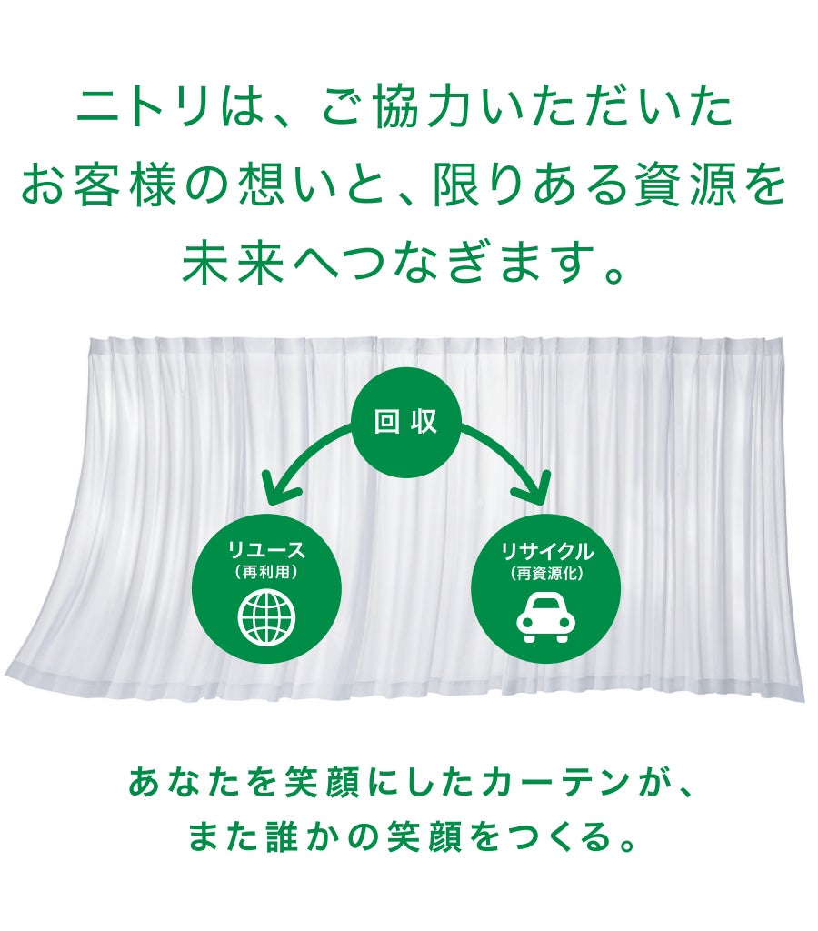 期間中、カーテンを店頭にお持ち込みいただいたお客様には、ご協力への感謝の気持ちをこめて、ニトリポイントを300ポイントプレゼントいたします。全国規模でのカーテン回収の取り組みは、今回で3回目となります。これまでの回収重量は累計約380トンに及び、全国で延べ約10万5,600人のお客様にご参加いただきました。ほぼ全量がリユース、リサイクルされています。