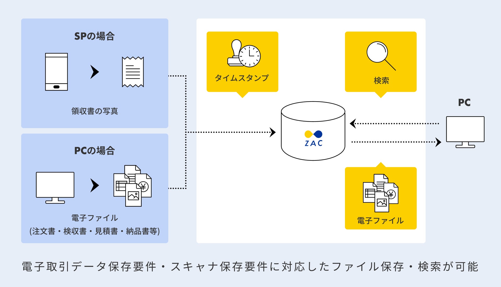 上記の背景から、これまでZACでは電子帳簿保存法対応機能である「電子証憑保管オプション」として取引先から受領する「(支払)請求書」「領収書」に関して要件を満たして保管する機能を提供してきました。この度、より広く電子帳簿保存法に対応いただけるように、以下の2つの機能アップデートを行いました。