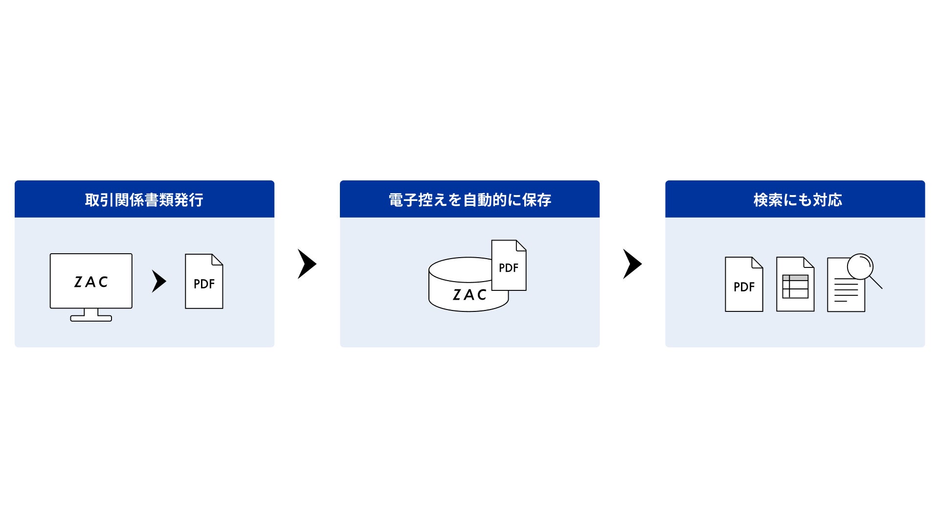 本アップデートにより、ZACから発行される「見積書・納品書・請求書」などの電子取引関係書類は、発行単位で電子控えがZAC内に自動保存され、発行履歴の検索が可能となります。