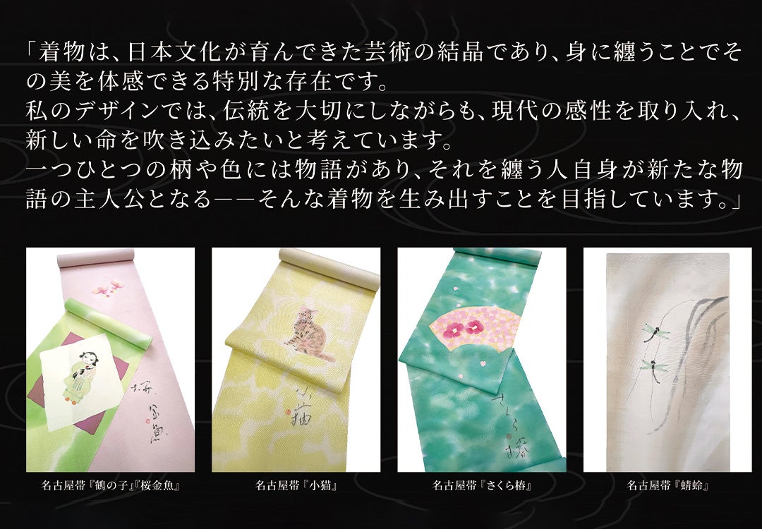 「着物は日本文化が育んできた芸術の結晶であり、身に纏うことでその美しさを体感できる特別な存在です。私のデザインでは、伝統を大切にしつつも現代の感性を取り入れ、新しい命を吹き込みたいと考えています。一つひとつの柄や色には物語があり、それを纏う人自身が新たな物語の主人公となる——そんな着物を生み出すことを目指しています。」