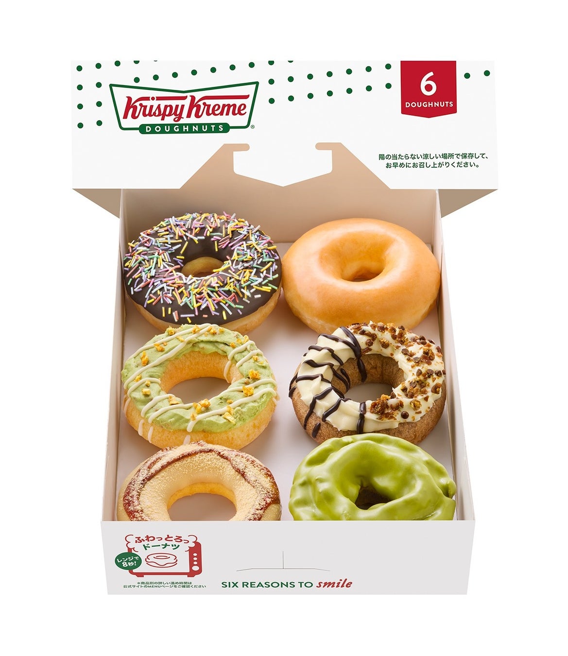 国産米粉入りのKome-Doughほうじ茶ラテ、玄米茶クリーム、黒蜜きなこの3種と、人気のオールドファッション 宇治抹茶、チョコ スプリンクル、定番のオリジナル・グレーズド®が勢ぞろい!