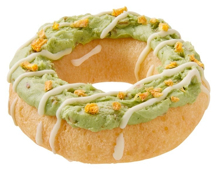 『Kome-Dough 玄米茶クリーム』は、「Kome-Dough」シリーズのふわふわもちもちの米粉入り生地の上に、香ばしい玄米パフ入りの爽やかなクリームをぐるりとのせました。その上にミルキーな味わいのホワイトチョコで線を描き、仕上げにフリーズドライオレンジを散りばめました。米粉生地のやさしい甘さの中に、玄米茶の香りがふわりと広がる、春らしい爽やかな和を感じることができるドーナツです。