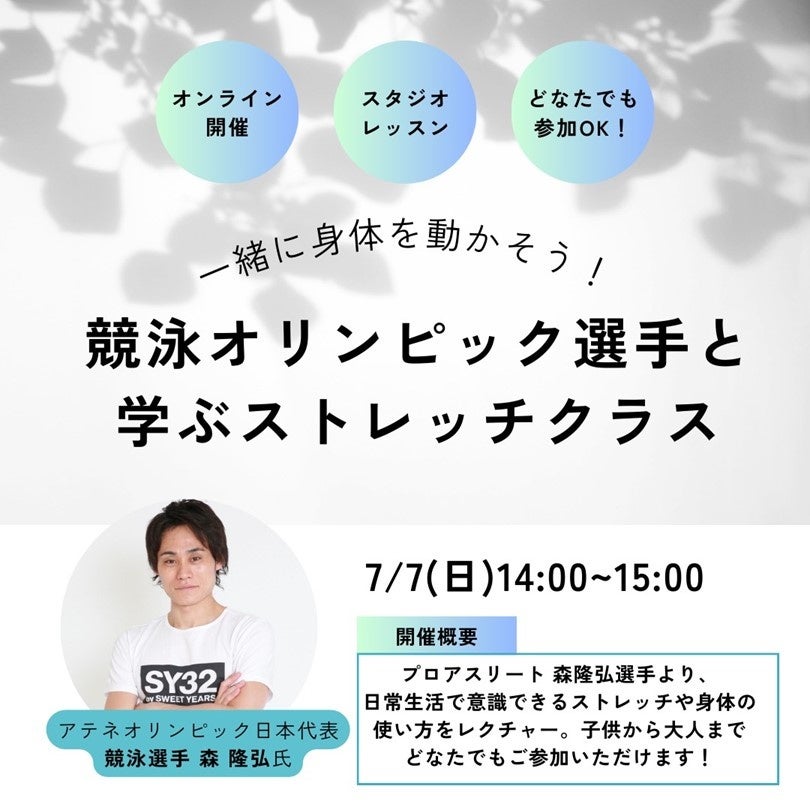 -開催概要- プロアスリートであり数多の水泳競技界で入賞・オリンピック入賞経験がある森隆弘選手に、日常生活で意識できるストレッチや身体の使い方をレクチャーしていただきます。