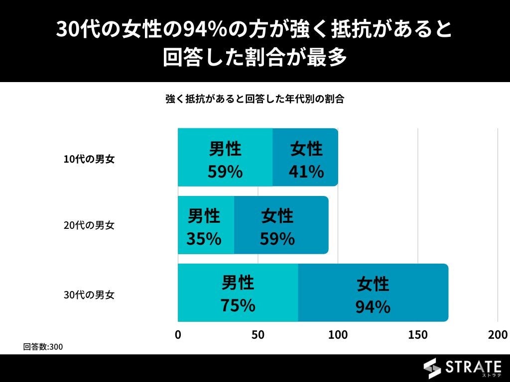 強く抵抗があると回答した割合を年代別でみてみますと、10代男性が59%、10代女性が41%、20代男性が35%、20代女性が59%、30代男性が75%、30代女性が94%という結果になりました。