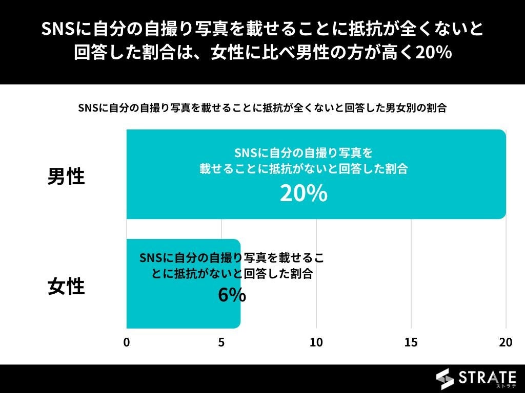 【SNSに自分の自撮り写真を載せることに抵抗が全くないと回答した割合は、女性に比べ男性の方が高く20%】