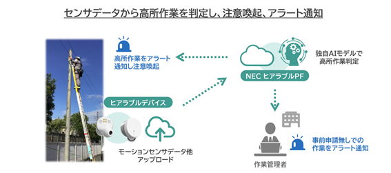 NECは、ヒアラブルデバイス (注1)で、建設業/製造業の高所作業の危険を予防する「高所作業検知ソリューション」の販売を本日より開始します。ヒアラブルデバイスのモーションセンサ、スマートフォンの環境センサ、NECが開発した独自AIモデルを用いて、梯子や電柱作業等の高所作業を検知し、作業者/作業管理者へのアラートを通じて現場作業の安全・安心を実現します。