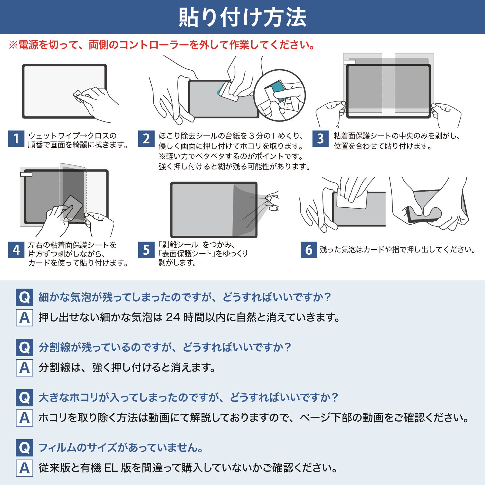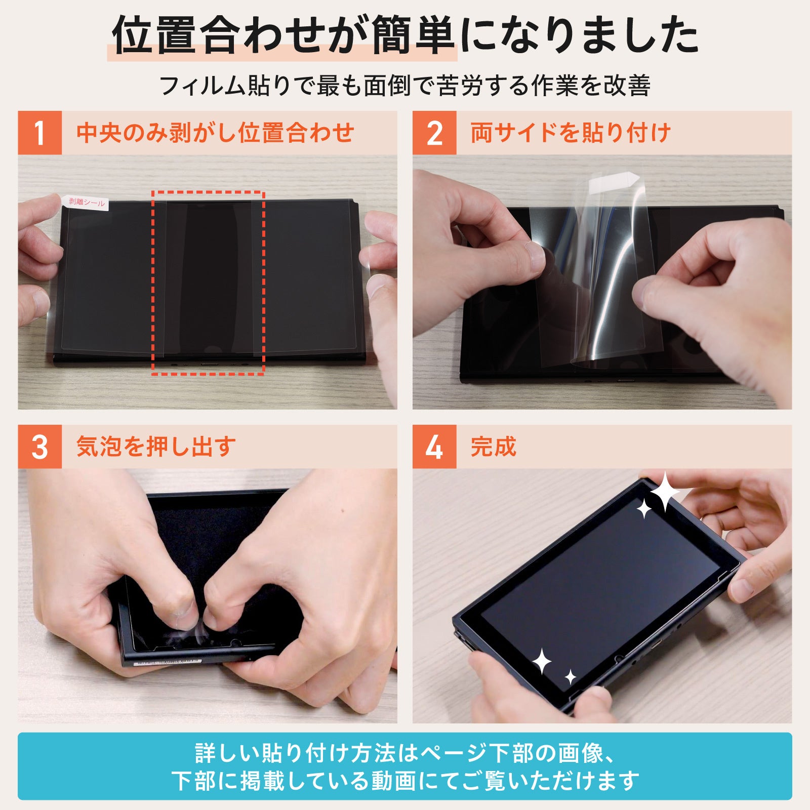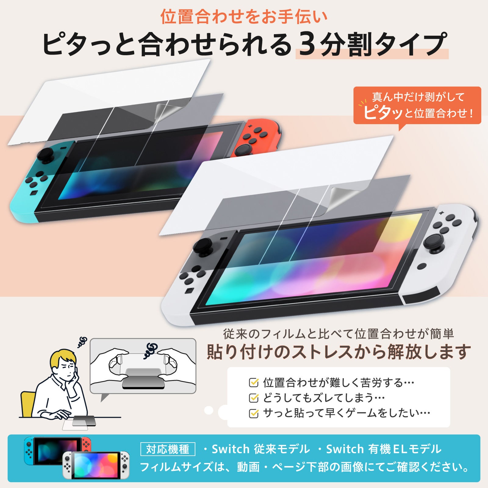 表面硬度3Hで、スイッチの液晶画面を擦り傷から守る極薄PET素材。貼りやすい三分割タイプの保護フィルムなので、今まで貼り付けサービスなどを利用していた方にもおすすめ。貼り方マニュアル動画付き