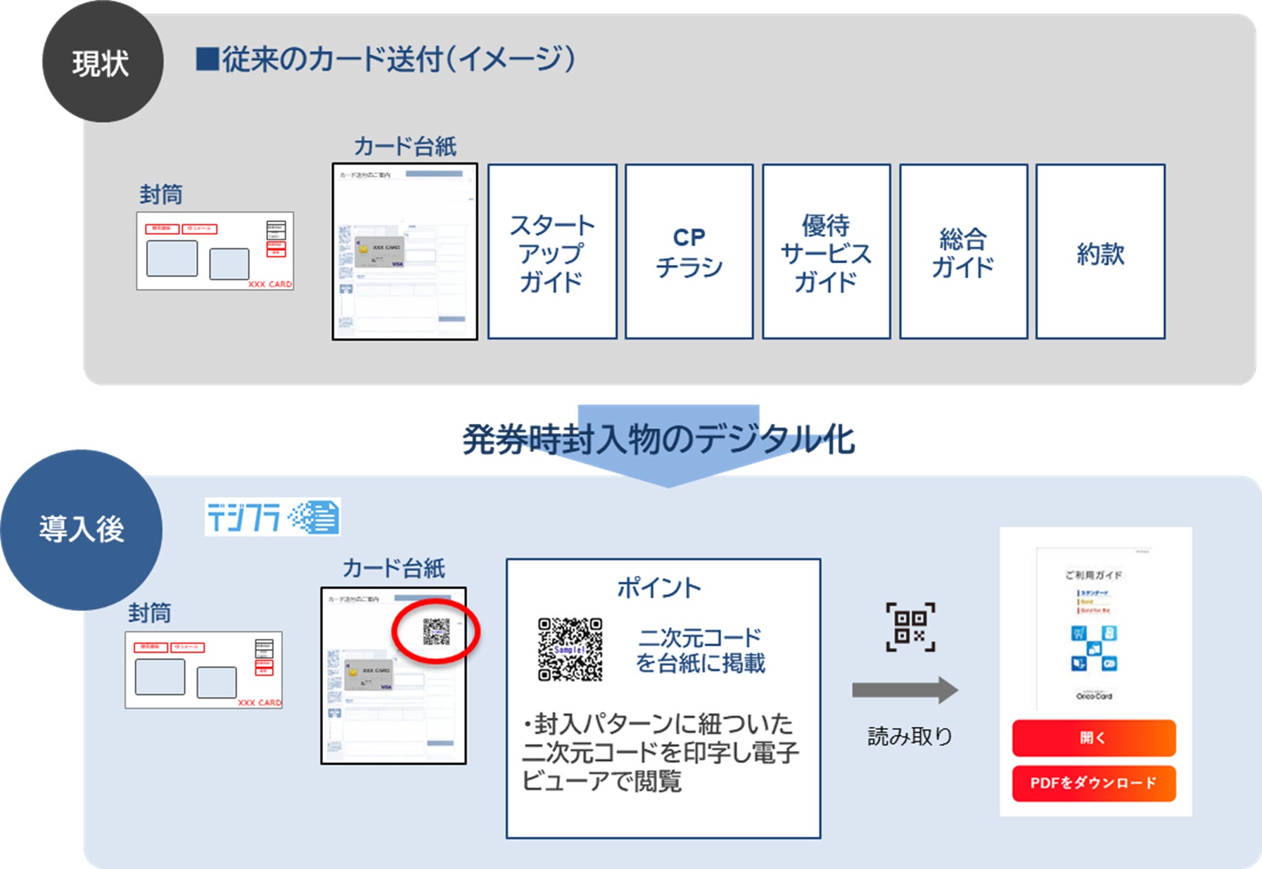「デジフラⓇ」は、クレジットカード発券時の同封物をデジタル化し、クレジットカードお届け時の台紙に「二次元コードおよびURL」を掲載し確認いただけるサービスです。今回の導入により、オリコのクレジットカード会員は、会員規約やご利用ガイドなどの情報が、お持ちのスマートフォンやパソコンなどで確認できるようになります。