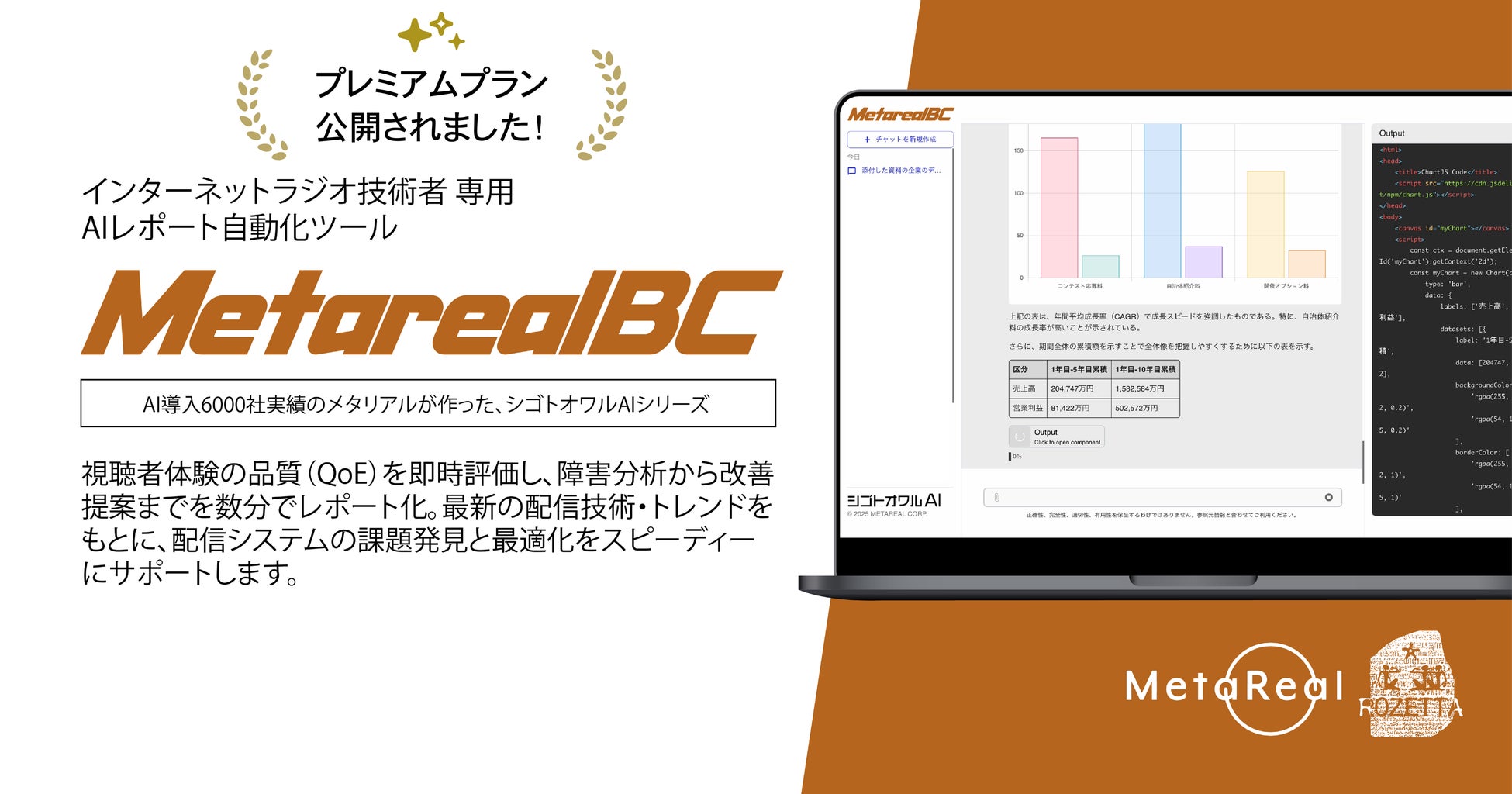 業種特化の専門AI開発・運営を行う株式会社メタリアル(本社:東京都千代田区、代表取締役:五石順一)は、コンテンツ配信技術者向け配信品質評価・最適化レポート作成AIエージェント「Metareal ブロードキャスト」(以下、Metareal BC) を1日20回・月200回使える月額5万円(税込)のプレミアムプランを7月14日(月)より提供開始しました。
